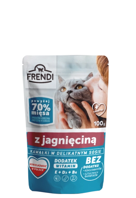 Frendi Kawałki W Delikatnym Sosie Z Jagnięciną 100g to doskonały wybór dla dorosłych kotów wszystkich ras. Kawałki mięsa z jagnięciny w delikatnym sosie to smakowita propozycja dla Twojego pupila. Zawierają aż 70% mięsa i produktów pochodzenia zwierzęcego, co zapewnia wysoką jakość składników. Produkt nie zawiera konserwantów ani sztucznych barwników, a jest bogaty w witaminy oraz składniki mineralne.