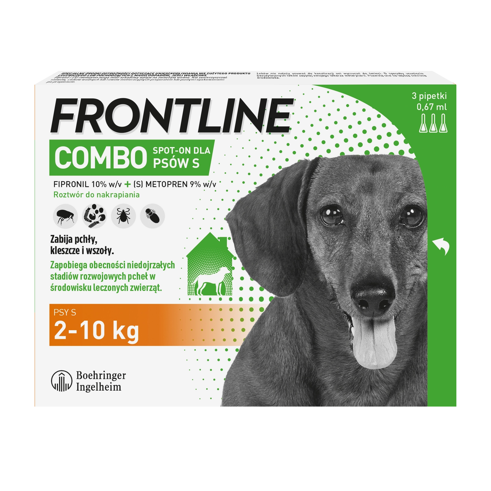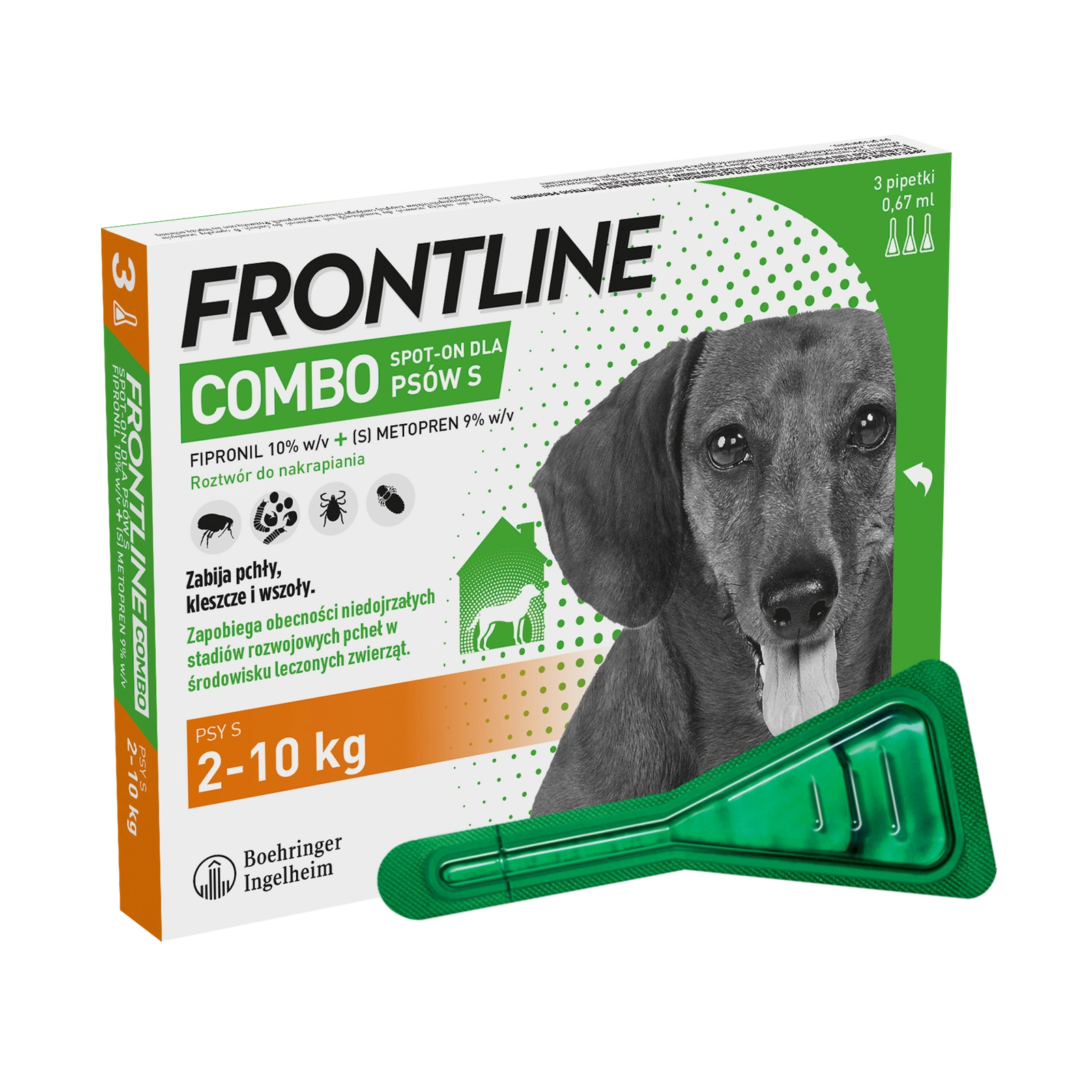 FRONTLINE Combo Spot-On Dla Psów 3x0,67ml to skuteczny preparat przeznaczony dla psów powyżej 8 tygodnia życia, ważących od 2 do 10 kilogramów. Dzięki szybkiemu działaniu i długotrwałej ochronie, zapewnia bezpieczeństwo Twojemu pupilowi przed pchłami i kleszczami.