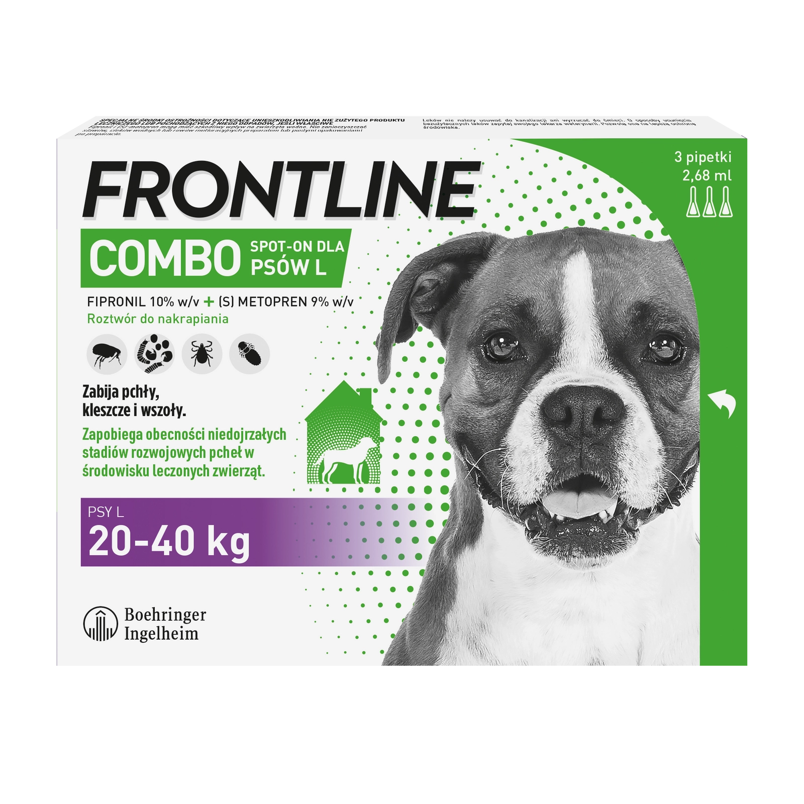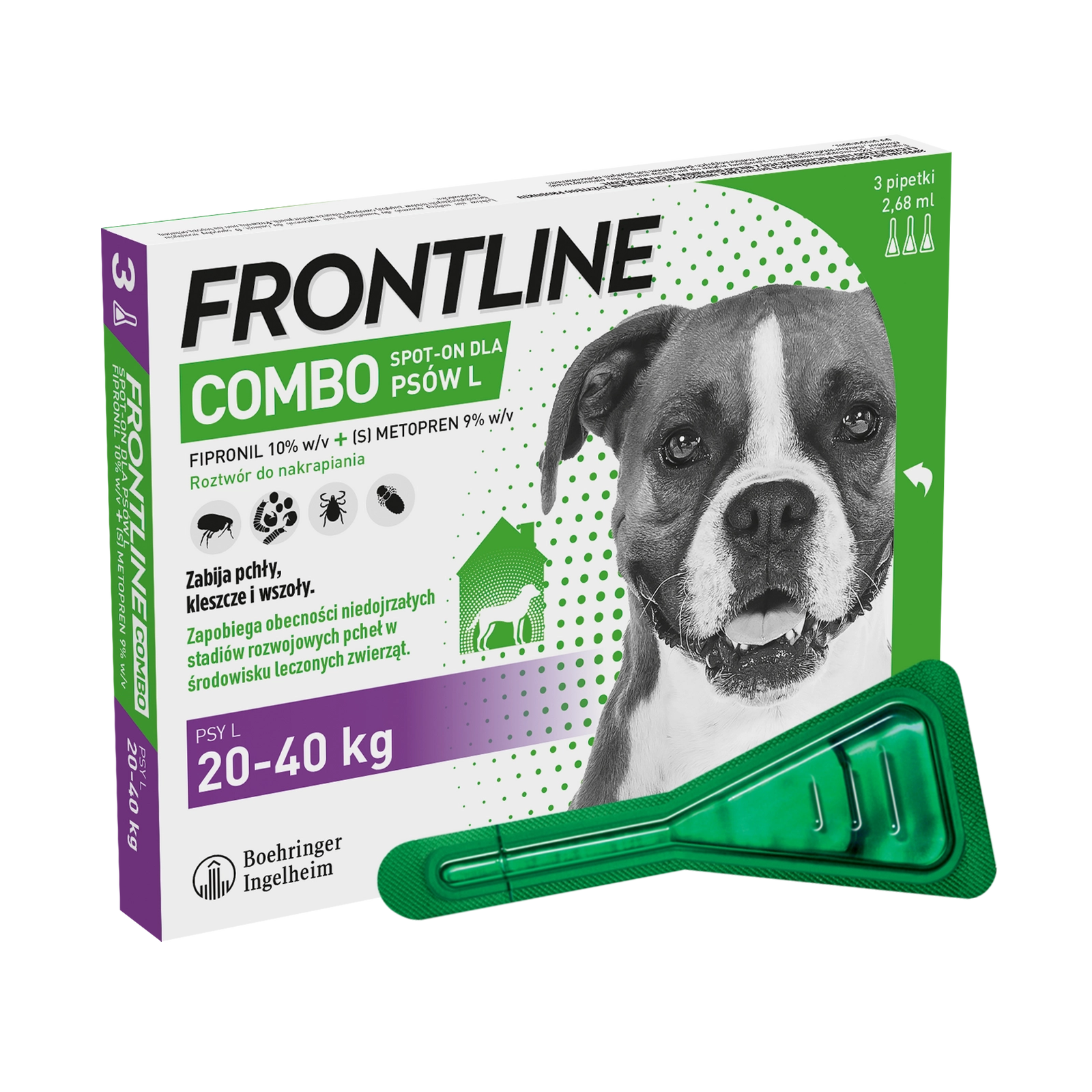 FRONTLINE Combo to skuteczny produkt przeznaczony dla psów, które mają więcej niż 8 tygodni i ważą od 20 do 40 kilogramów. Dzięki jednorazowej aplikacji zapewnia miesięczną ochronę przed pchłami i kleszczami. Działa szybko i jest odporny na działanie wody.