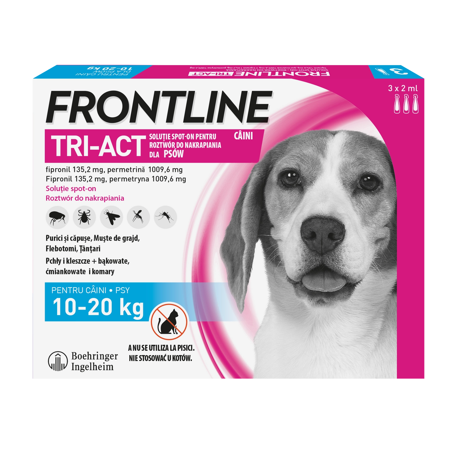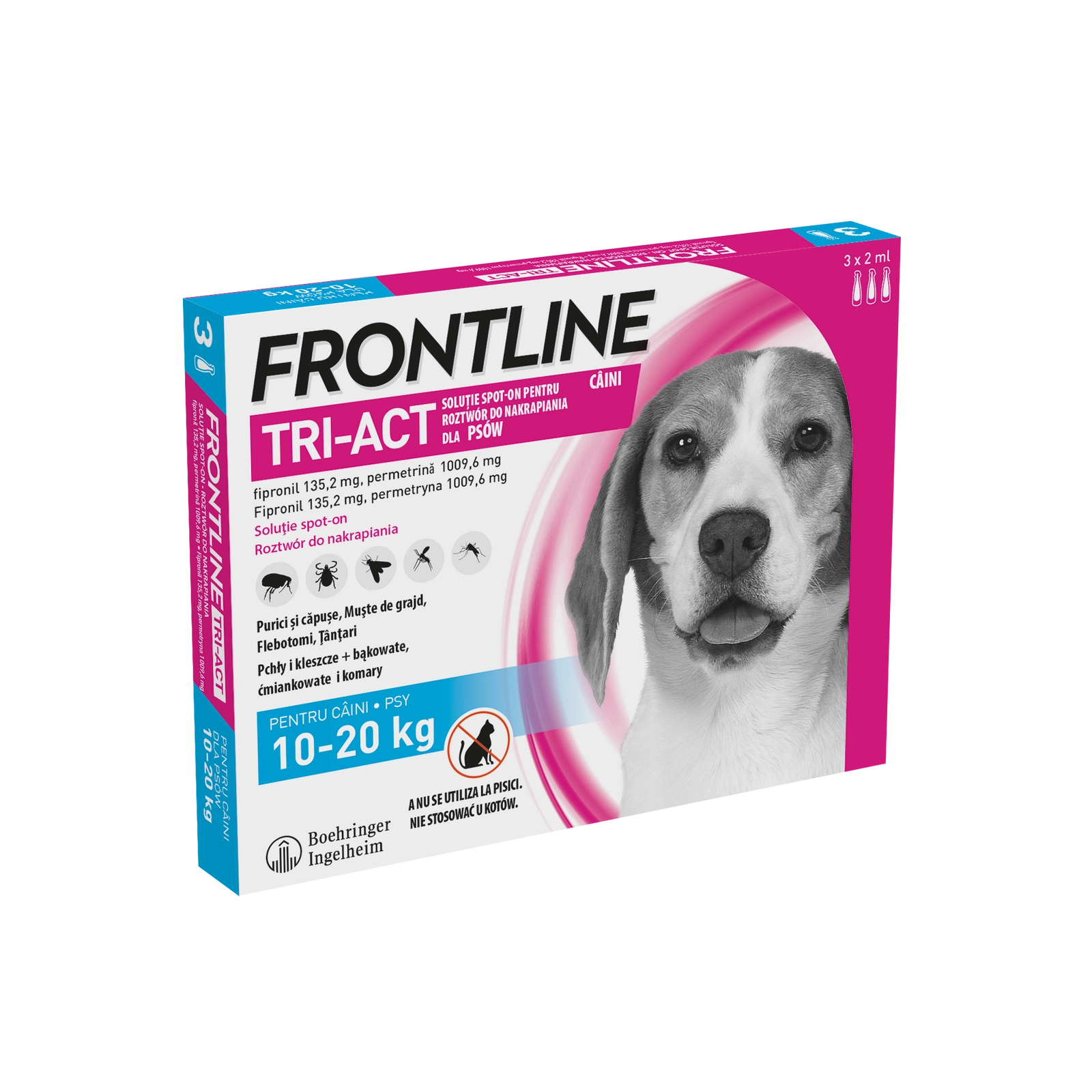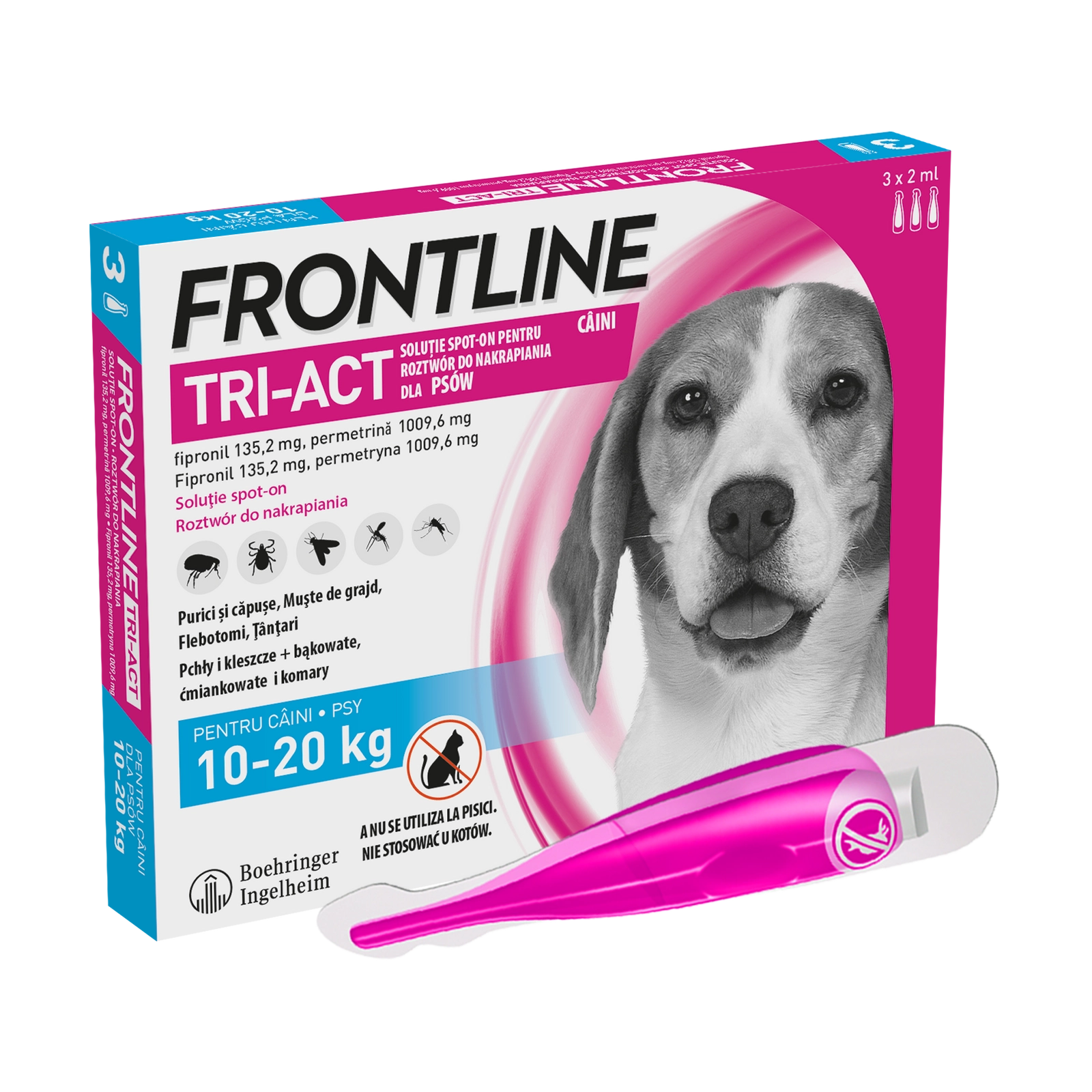 FRONTLINE Tri-Act to skuteczna ochrona dla psów ważących od 10 do 20 kg, które mają więcej niż 8 tygodni. Produkt zapewnia szybkie działanie, eliminując pchły i kleszcze oraz chroniąc przed ich ponowną inwazją przez cały miesiąc. Jest wodoodporny, co oznacza, że działa nawet po zmoczeniu zwierzęcia.
