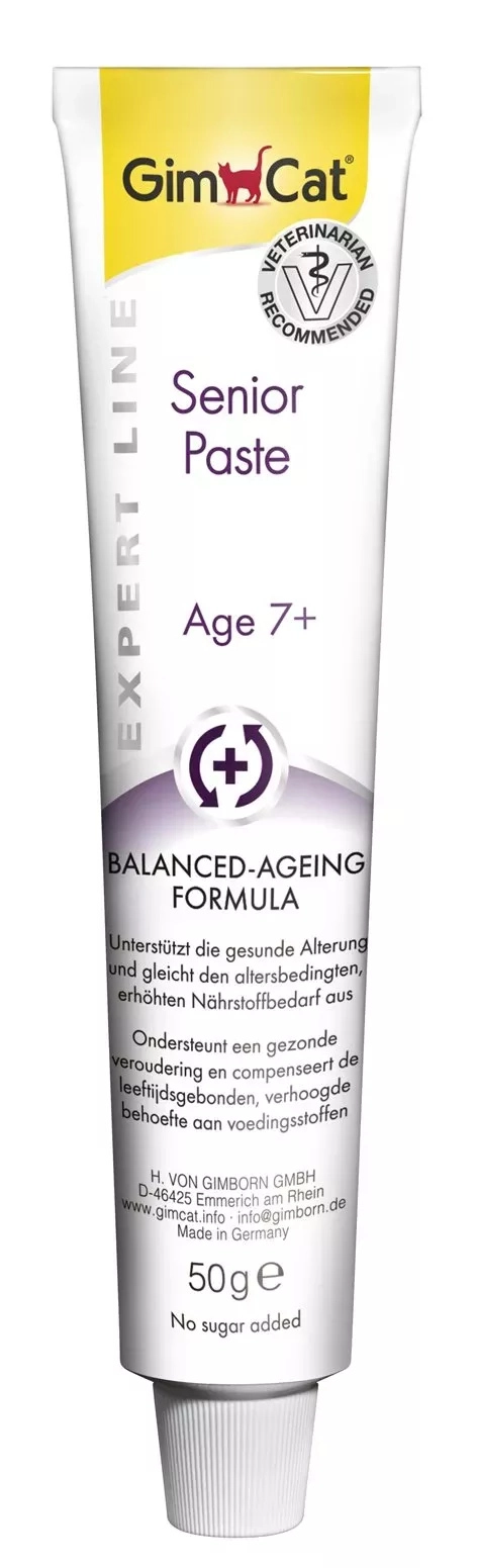 Pasta Senior GimCat to produkt stworzony z myślą o starszych kotach, które mają już 7 lat lub więcej. Dzięki specjalnie dobranym składnikom wspiera zdrowie i dobre samopoczucie Twojego pupila.