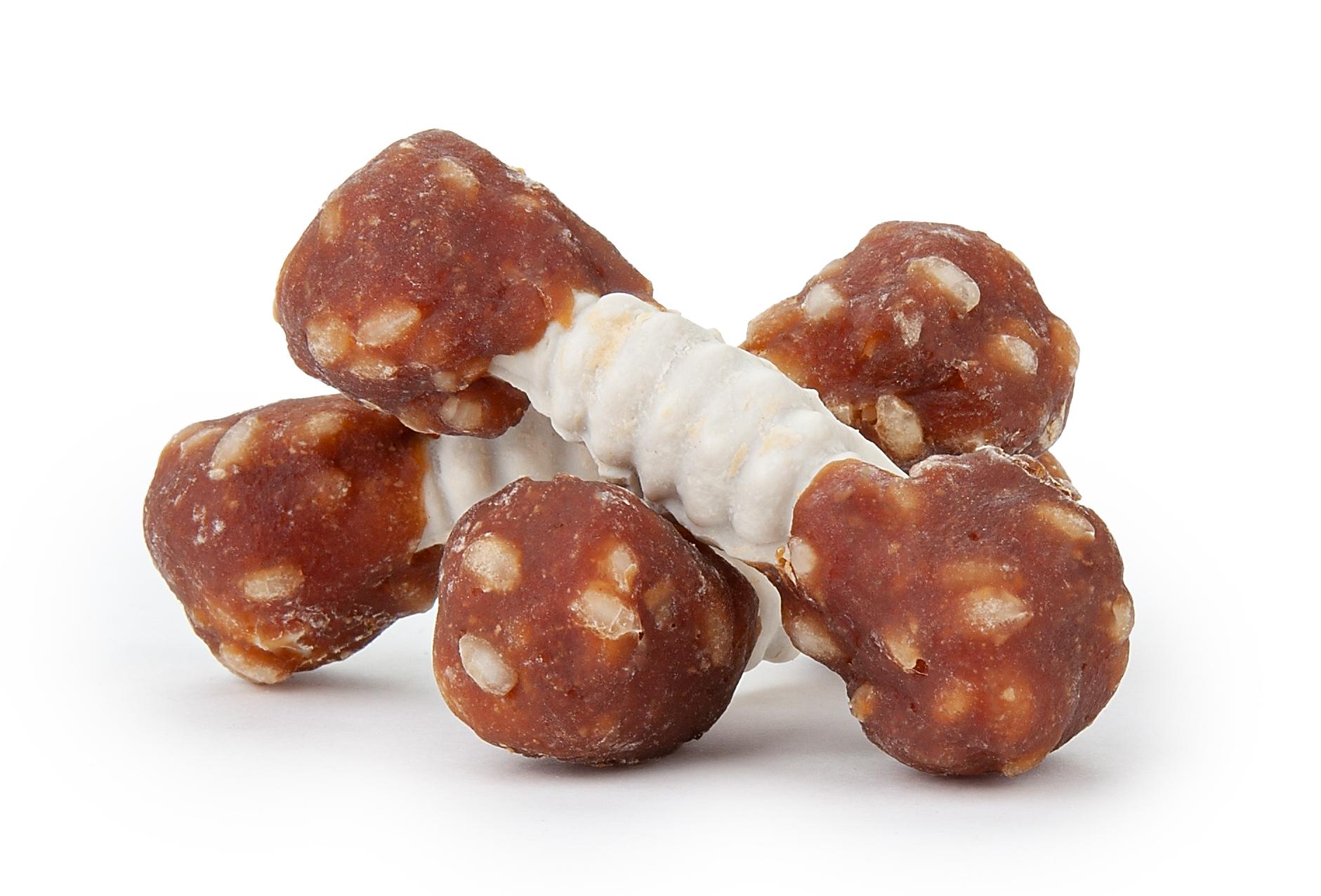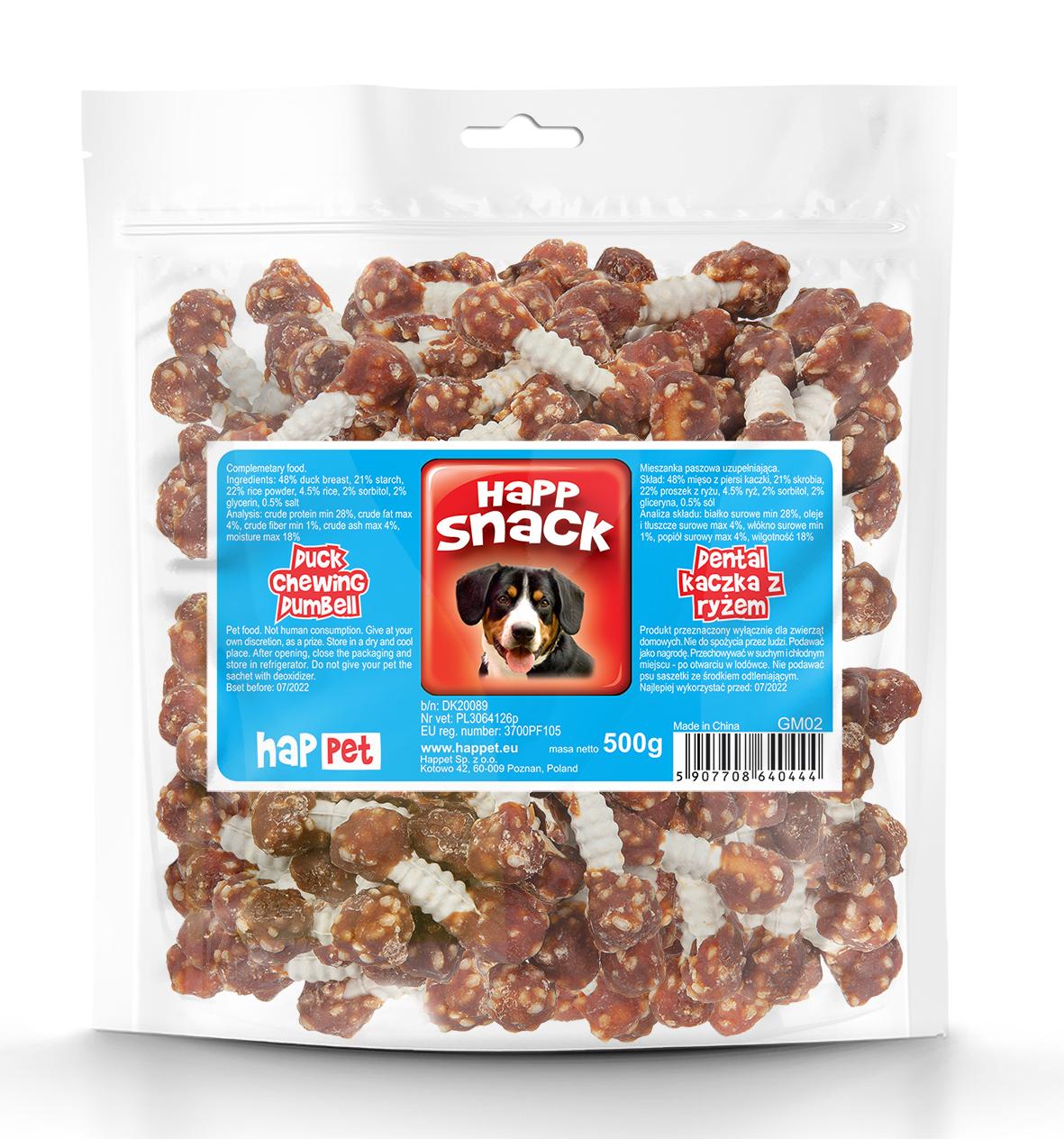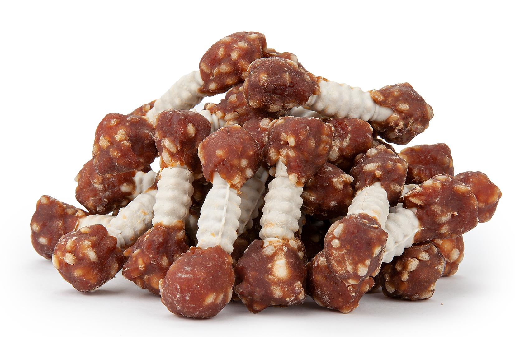 Skład: 48% mięso z piersi kaczki, 22% proszek z ryżu, 4,5% ryż, 2% gliceryna, 2% sorbitol, 21% skrobia, 0,5% sól.