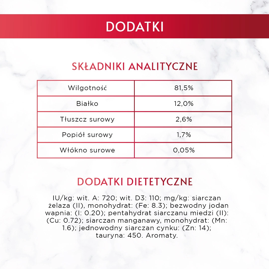 Każda saszetka to pełnowartościowe danie, które można podawać samodzielnie. Dodatek ryb dostarcza cennych kwasów tłuszczowych, wspierających zdrową skórę i lśniącą sierść. Karma jest wolna od sztucznych barwników i konserwantów, co czyni ją bezpieczną do regularnego stosowania.