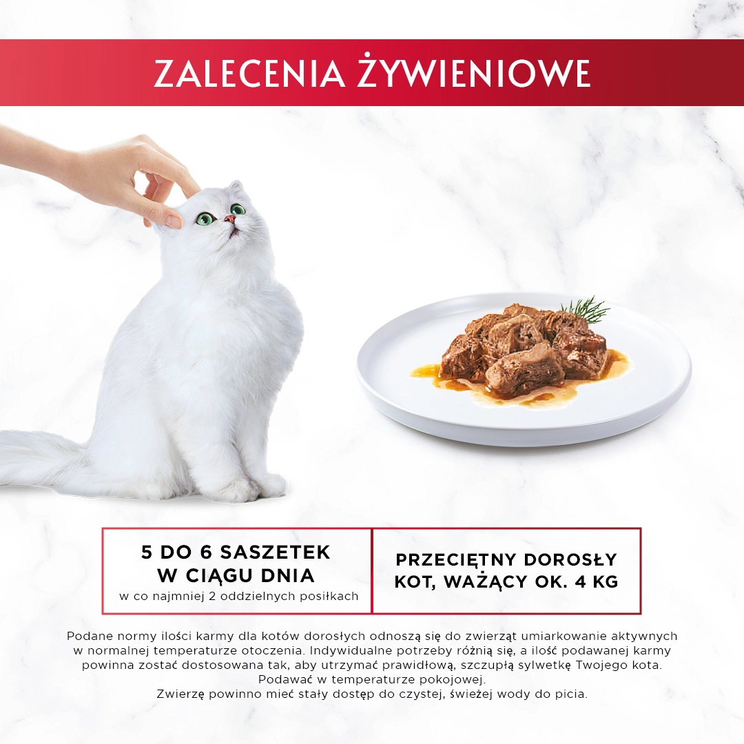 Każda saszetka zawiera soczyste kawałki mięsa w aromatycznym sosie, co sprawia, że nawet najbardziej wybredne koty będą zachwycone smakiem.