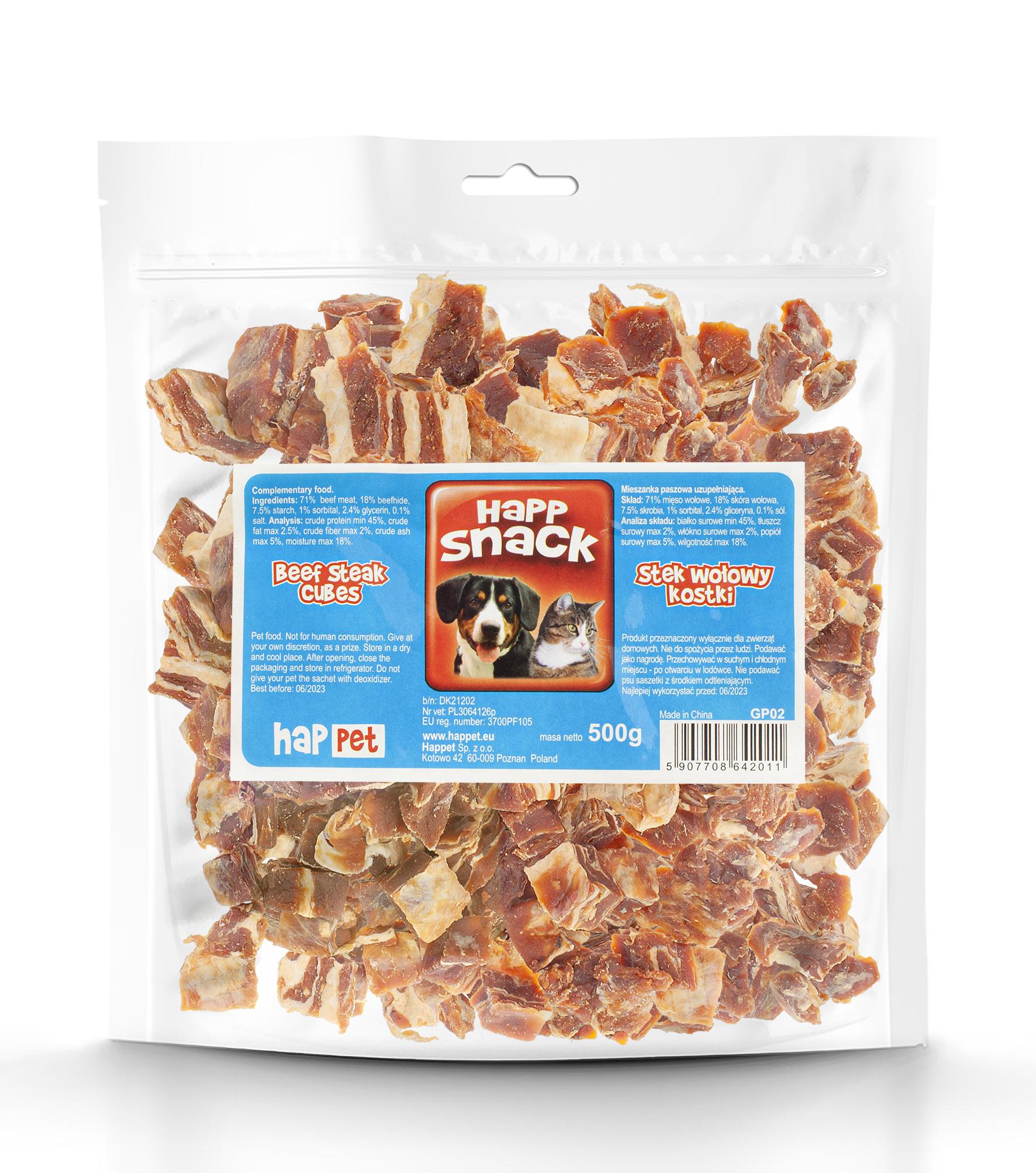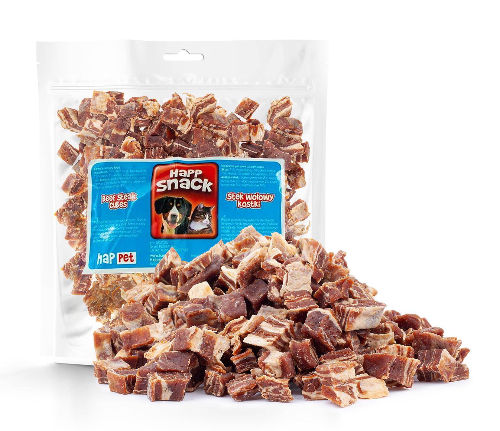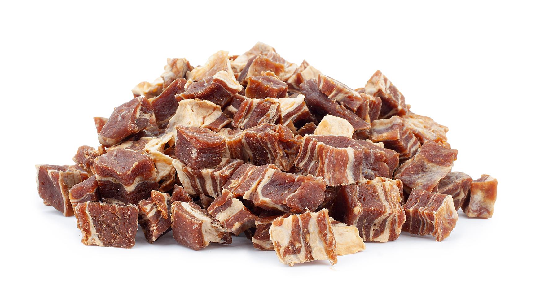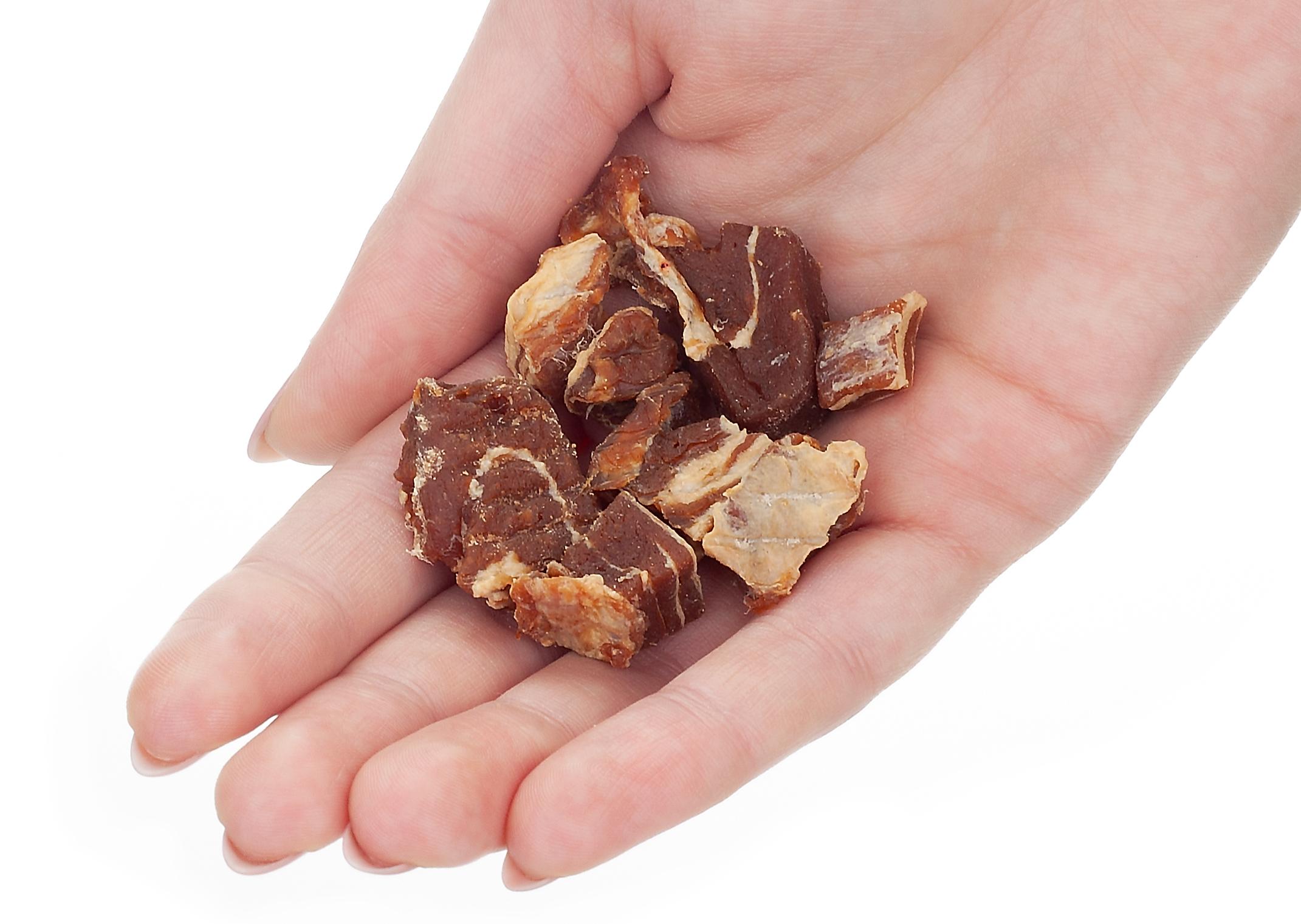 Produkt jest suszony, co zapewnia mu długą trwałość, a brak sztucznych konserwantów sprawia, że jest bezpieczny dla Twojego pupila. Stek wołowy kostki można podawać jako nagrodę lub przysmak między posiłkami.