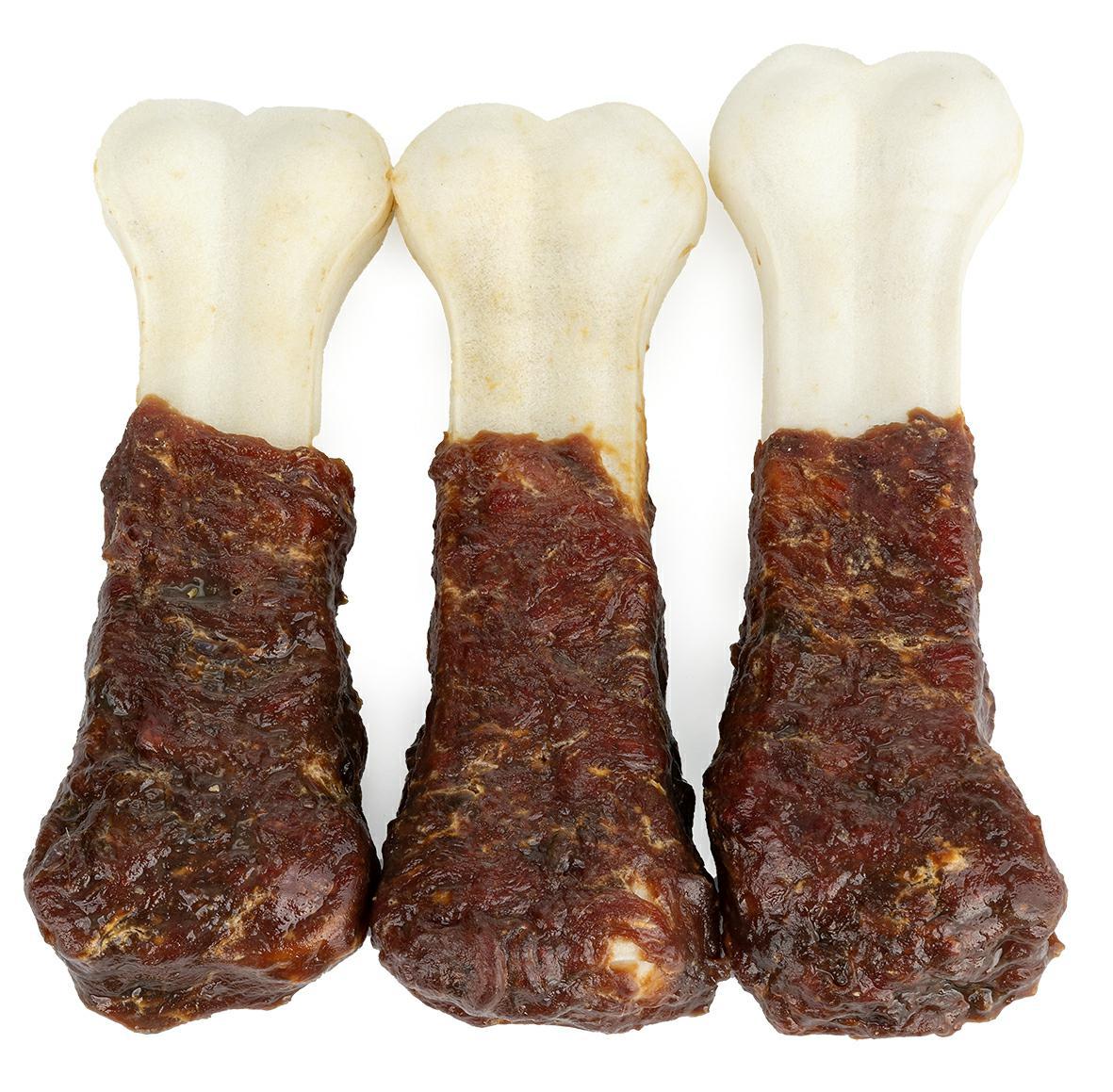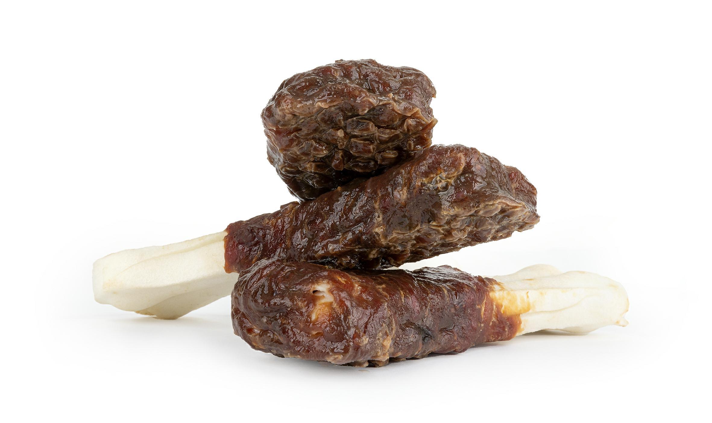 Biała, prasowana kość ze skóry wołowej owinięta mięsem jagnięcym.
