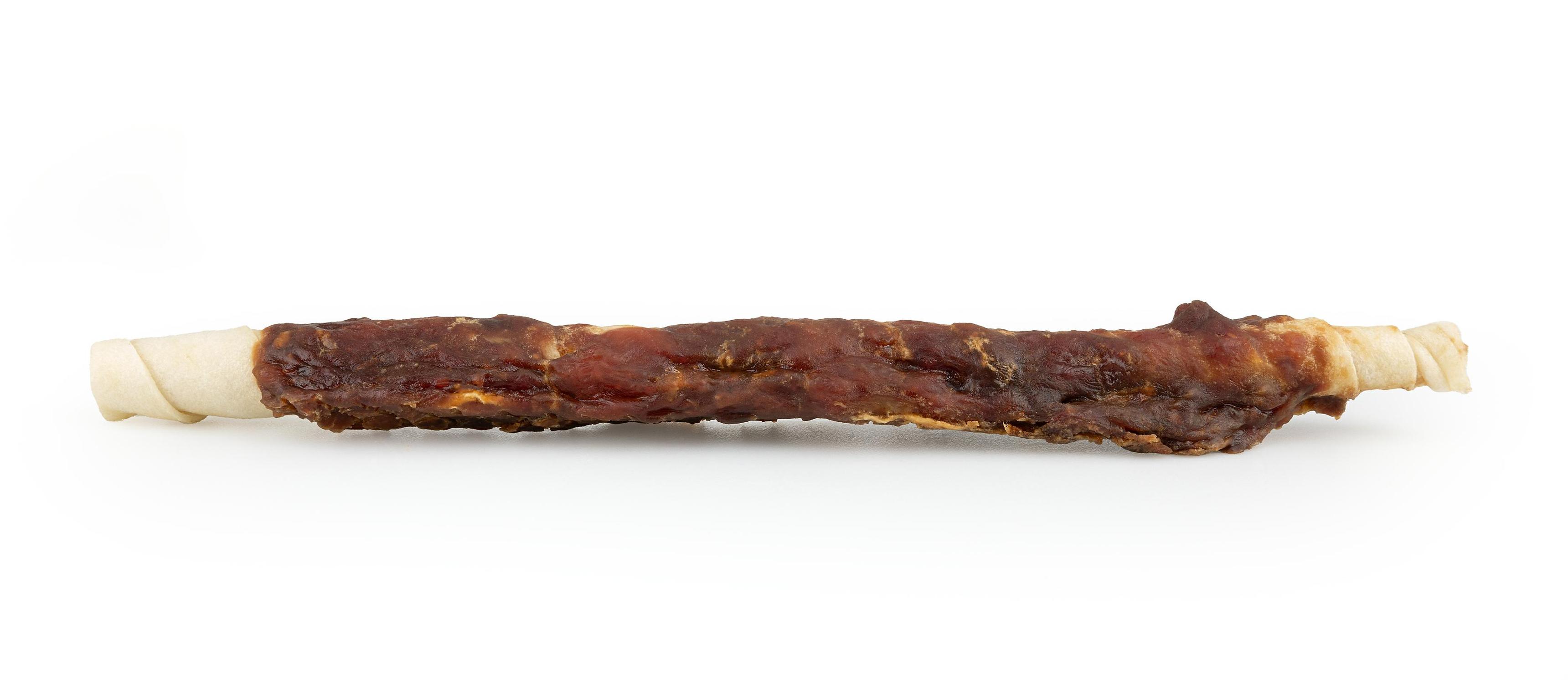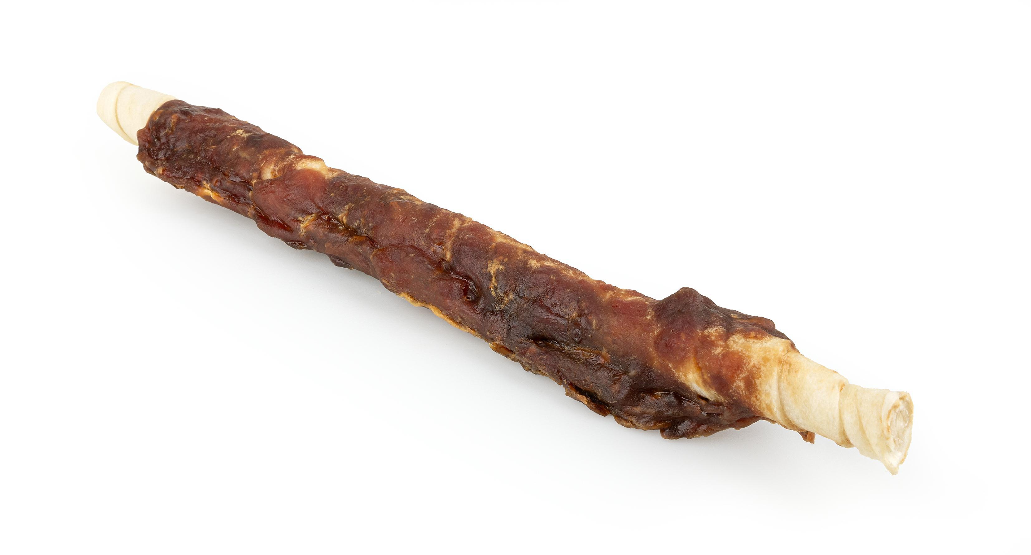 Duże, białe pałki z prasowanej skóry wołowej owinięte mięsem jagnięcym.