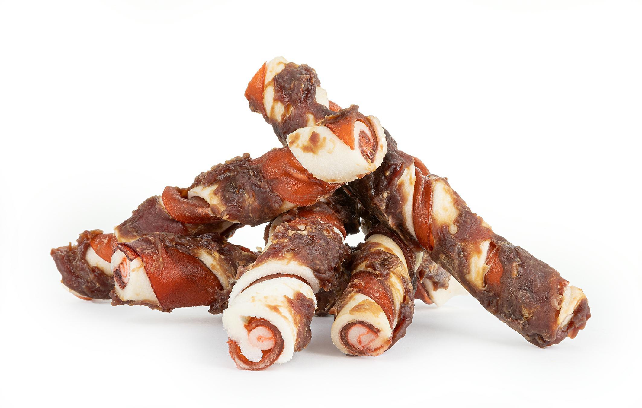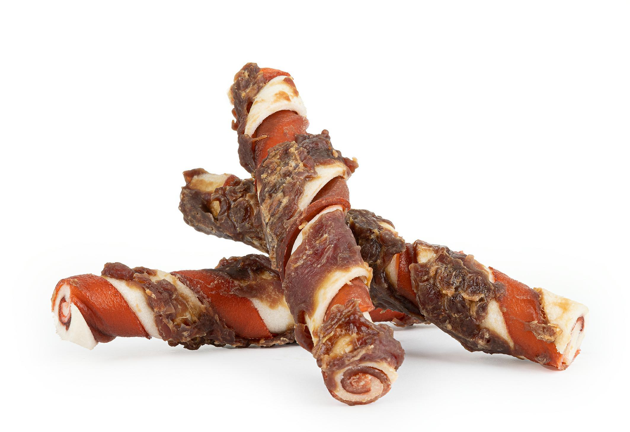Biała, prasowana pałka ze skóry wołowej owinięta mięsem jagnięcym i skórą wołową. Wygląda bardzo apetycznie i zachęcająco dla każdego psa.
