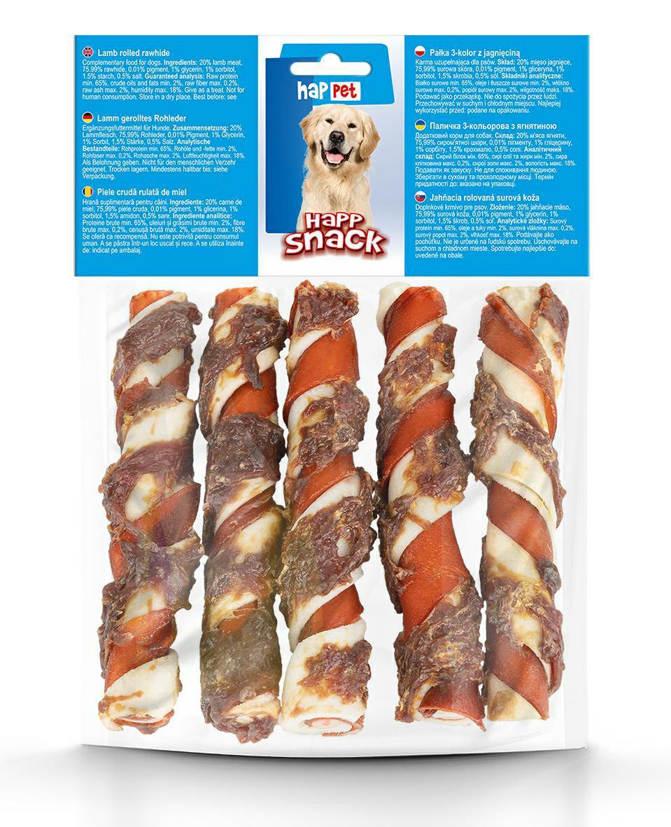 Skład: 20% mięso jagnięce, 75,99% skóra bydlęca, 0,01% barwnik, 1% gliceryna, 1% sorbitol, 1,5% skrobia, 0,5% sól