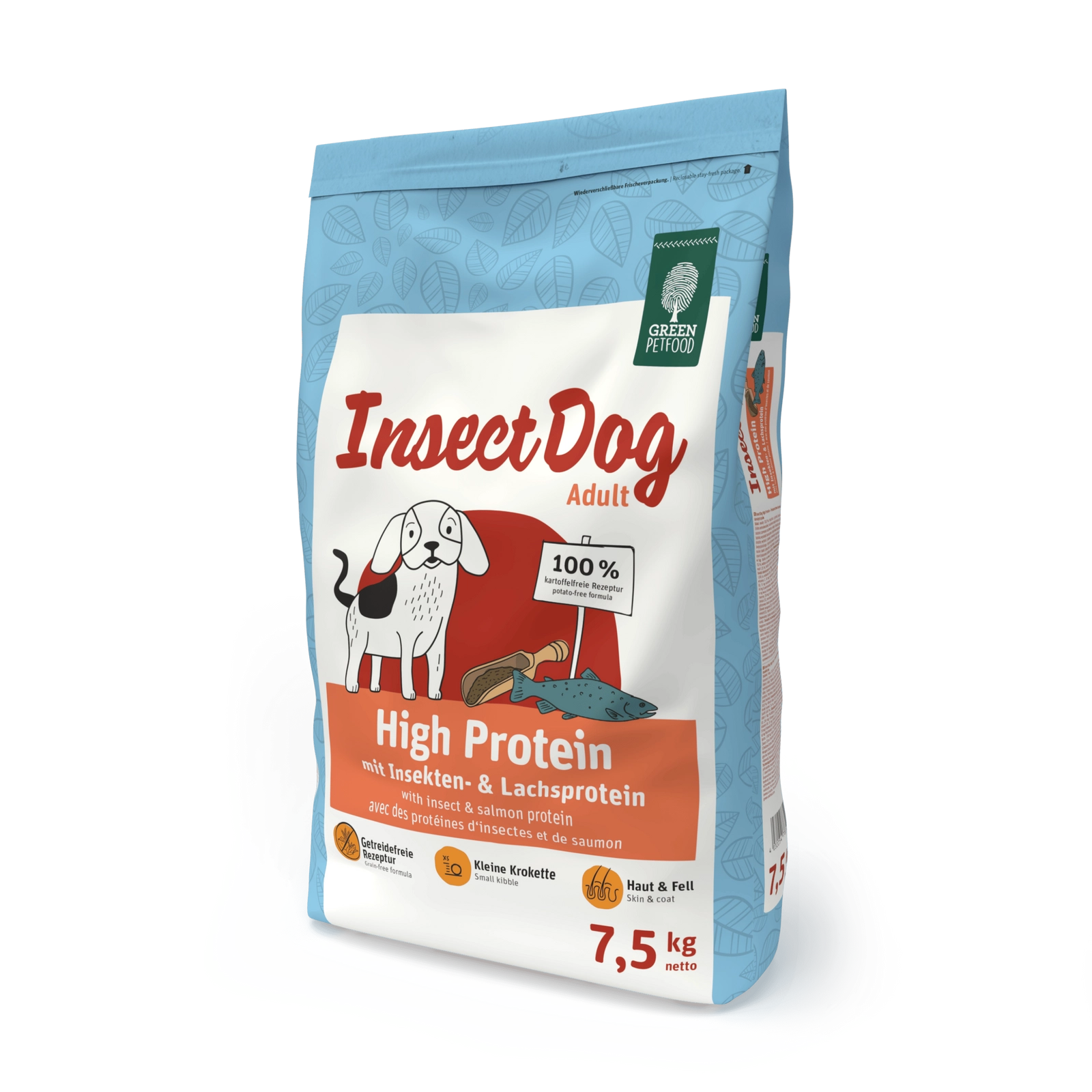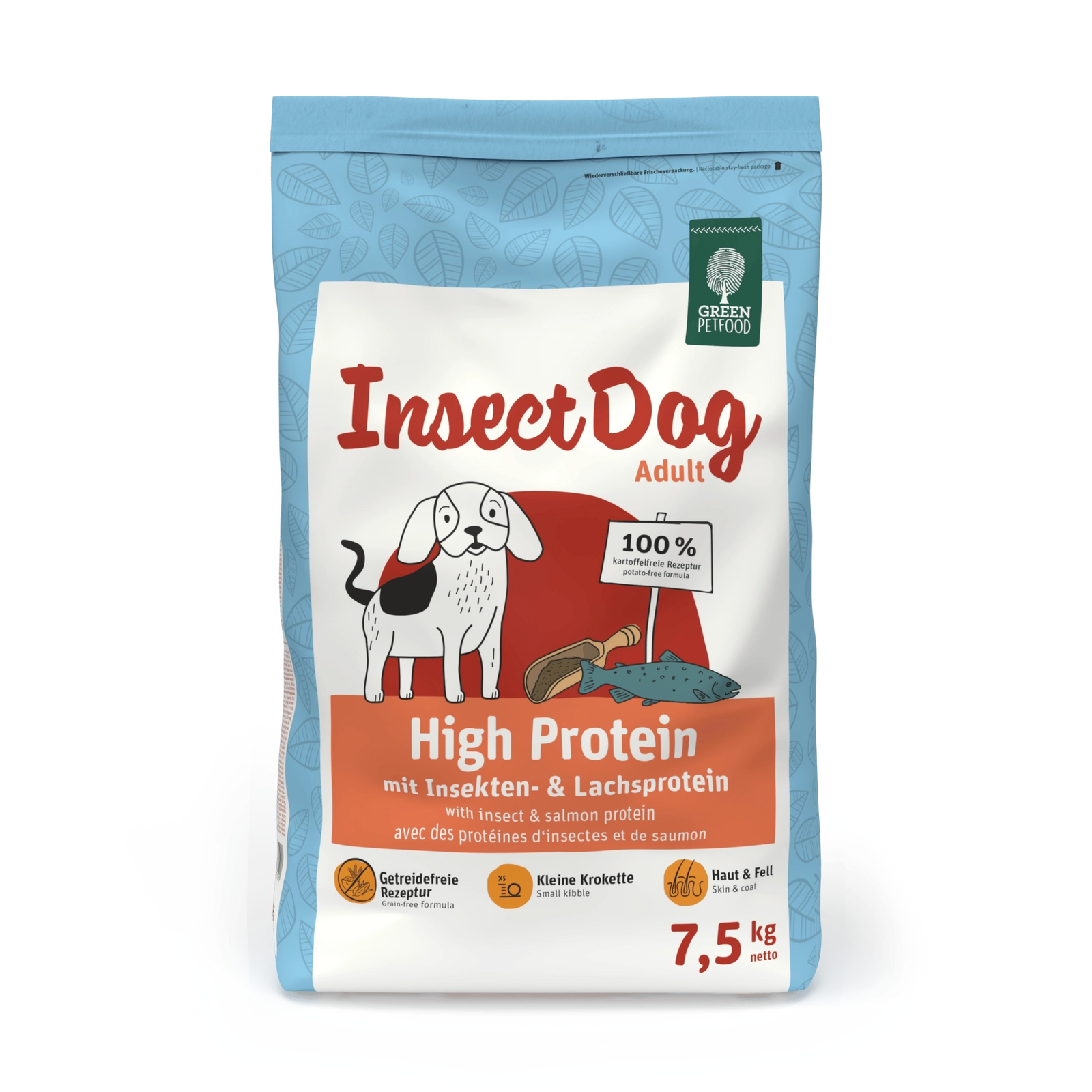 GREEN PETFOOD InsectDog High Protein 7,5kg – Karma Bezzbożowa z Owadem i Łososiem to pełnoporcjowa karma stworzona z myślą o psach dorosłych, której receptura nie zawiera ziemniaków ani zbóż. Zamiast tradycyjnych składników, InsectDog High Protein wykorzystuje białko owadów i łososia, co stanowi zdrową i ekologiczną alternatywę dla tradycyjnych źródeł białka. Owady są zrównoważonym źródłem białka przyszłości, idealnym dla psów wrażliwych na tradycyjne składniki.