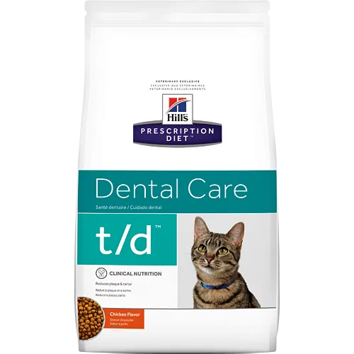 Hill's Prescription Diet t/d to pełnoporcjowa karma dla dorosłych kotów, która wspiera zdrowie jamy ustnej dzięki innowacyjnej technologii dentystycznej. Produkt skutecznie redukuje powstawanie płytki nazębnej, przebarwień oraz kamienia nazębnego, a także czyści zęby aż do linii dziąseł.