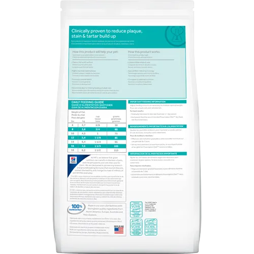 Karma posiada unikalną strukturę, która działa jak szczoteczka do zębów, usuwając bakterie i poprawiając zdrowie dziąseł. Duży rozmiar i kształt brykietów sprawiają, że zęby są czyszczone skutecznie aż do linii dziąseł, co wspiera ich zdrowie. Żywienie suchą karmą Hill's Prescription Diet t/d jest rekomendowane, ponieważ większość opiekunów kotów nie myje im zębów regularnie.