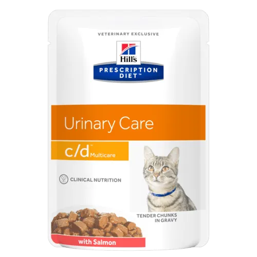 Hill's Prescription Diet c/d Multicare Feline Salmon 85g to pełnoporcjowa karma dietetyczna dla kotów, stworzona w celu zmniejszenia ryzyka kamicy struwitowej. Dzięki właściwościom zakwaszającym mocz oraz kontrolowanemu poziomowi magnezu, skutecznie ogranicza nawroty kamicy moczowej.