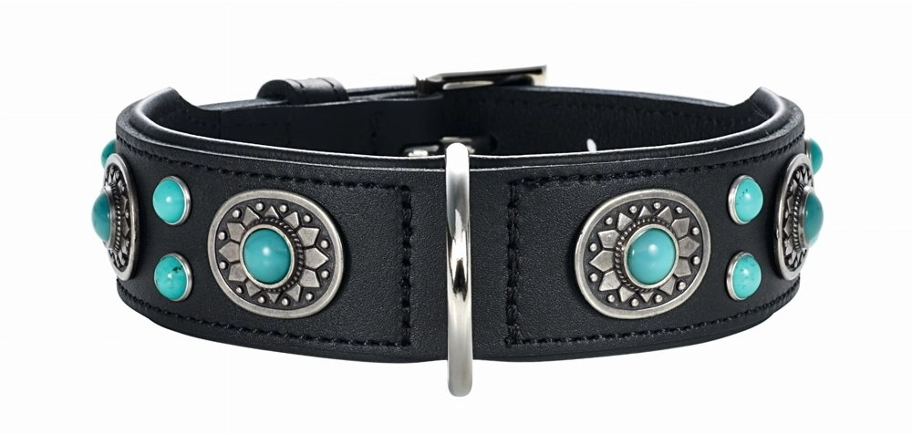 Obroża ze skóry bydlęcej z metalowymi medalionami. W kolorze czarnym, o długości 50cm.