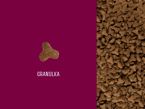 Skład: kukurydza pełnoziarnista, suszone białko drobiowe, ryż, wysłodki buraczane, skwarki, suszony łosoś, tłuszcz drobiowy, hydrolizowane białko zwierzęce, hydrolizowane białko drobiowe, włókna roślinne, mączka z cykorii, minerały.