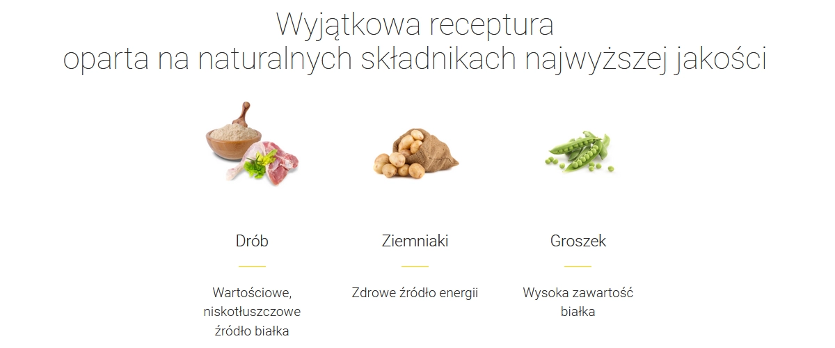 W składzie znajdziesz suszone białko drobiowe, tłuszcz drobiowy, suszone ziemniaki, mączkę z grochu, wysłodki buraczane, suszoną tapiokę, białko ziemniaczane, hydrolizowane białko ryb, suszoną wątróbkę drobiową oraz olej z łososia.