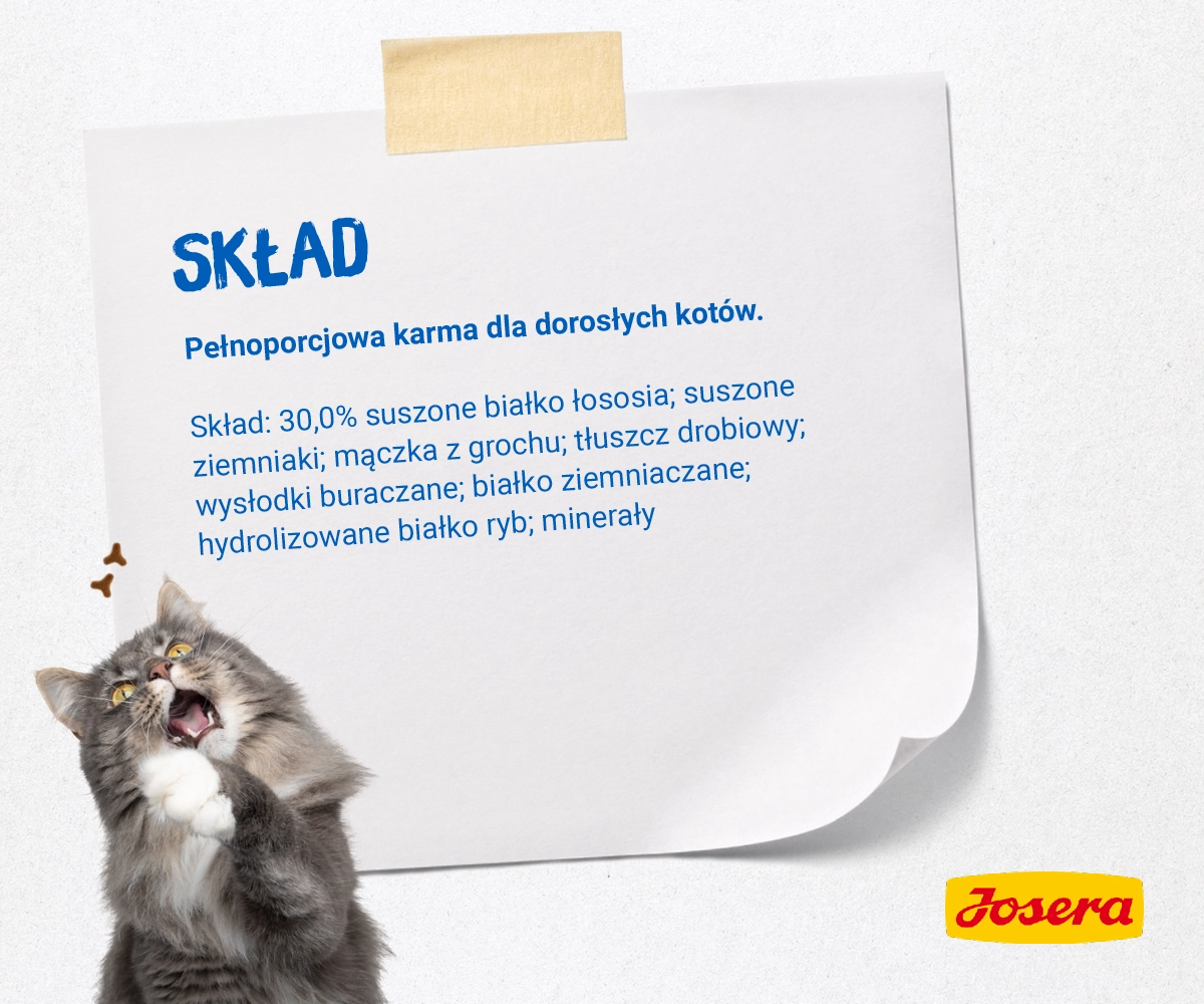 Skład: suszony łosoś 30%, suszone ziemniaki, tłuszcz drobiowy, mączka z grochu, białko ziemniaczane, wysłodki buraczane, hydrolizowane białko ryb, minerały.