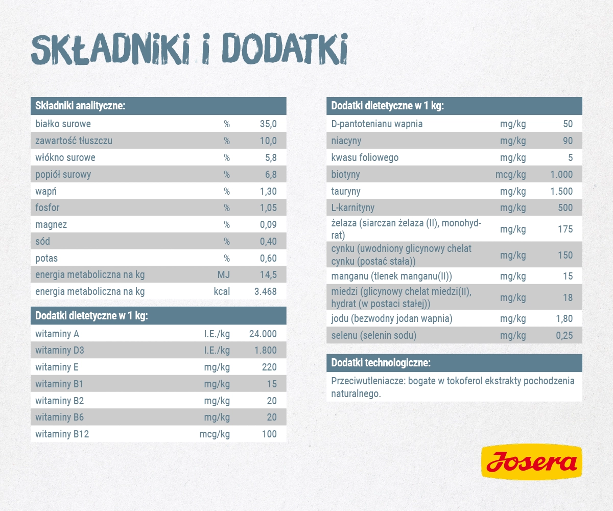 W składzie karmy znajdują się witaminy, które wspierają układ odpornościowy. Josera Leger to doskonały wybór dla kotów, które potrzebują zbilansowanej diety w walce z nadwagą oraz dla tych po kastracji.