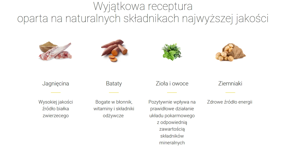 Skład: suszone białko jagnięce (25%), suszone ziemniaki, suszone bataty, tłuszcz drobiowy, białko ziemniaczane, wysłodki buraczane, mączka z chleba świętojańskiego, częściowo hydrolizowane drożdże, minerały, hydrolizowane białko zwierzęce, wytłoki z jabłek, zioła, owoce, suszony korzeń cykorii.