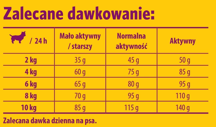 | Waga psa | Mało aktywny / starszy | Normalna aktywność | Aktywny |