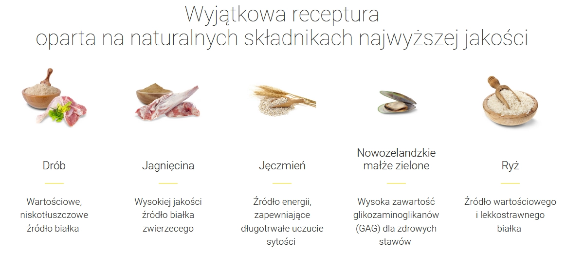 W składzie znajdują się lekkostrawne składniki, co zapewnia łatwą przyswajalność pokarmu. Odpowiednia proporcja składników wspiera zdrowie kości, stawów oraz kondycję skóry i sierści. Karma zawiera m.in. mączkę drobiową, ryż, jęczmień i mączkę jagnięcą.