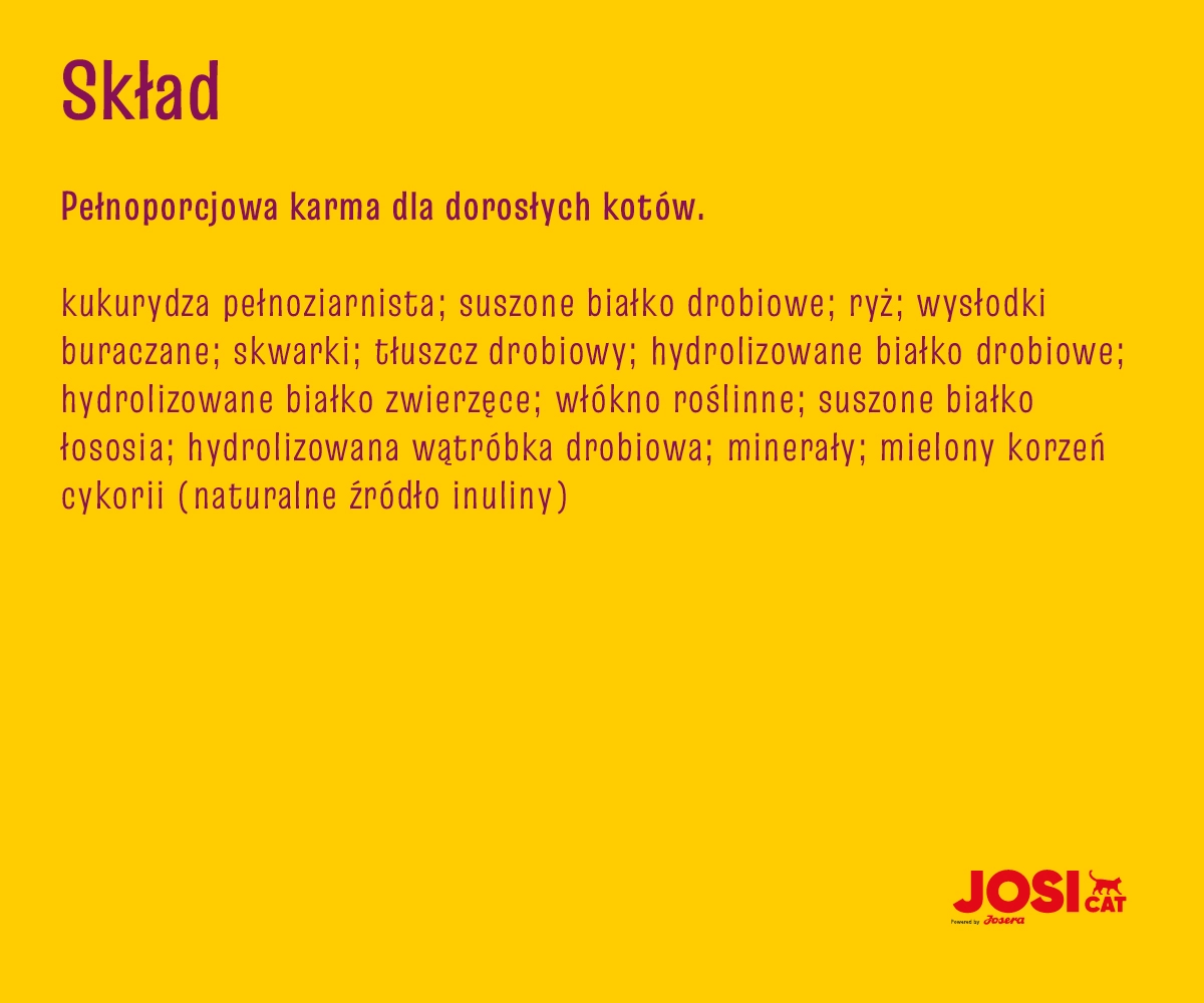 JosiCat Sterilised Classic to pełnoporcjowa karma dla dorosłych kotów sterylizowanych. Oferuje zbilansowaną dietę, która odpowiada na potrzeby Twojego kota. Dzięki niskiej zawartości tłuszczu (10,0%) oraz wysokiej zawartości białka (32,0%), wspiera prawidłowy metabolizm i pomaga w utrzymaniu optymalnej wagi.