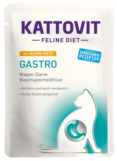 Kattovit Feline Diet Gastro to specjalistyczna karma dla kotów, stworzona z myślą o ich problemach trawiennych. Dzięki niskiej zawartości tłuszczu oraz lekkostrawnemu składowi, wspomaga procesy trawienne i zewnątrzwydzielniczą niewydolność trzustki. Dodatkowo, wysoka zawartość elektrolitów zapewnia prawidłową równowagę płynów w organizmie.