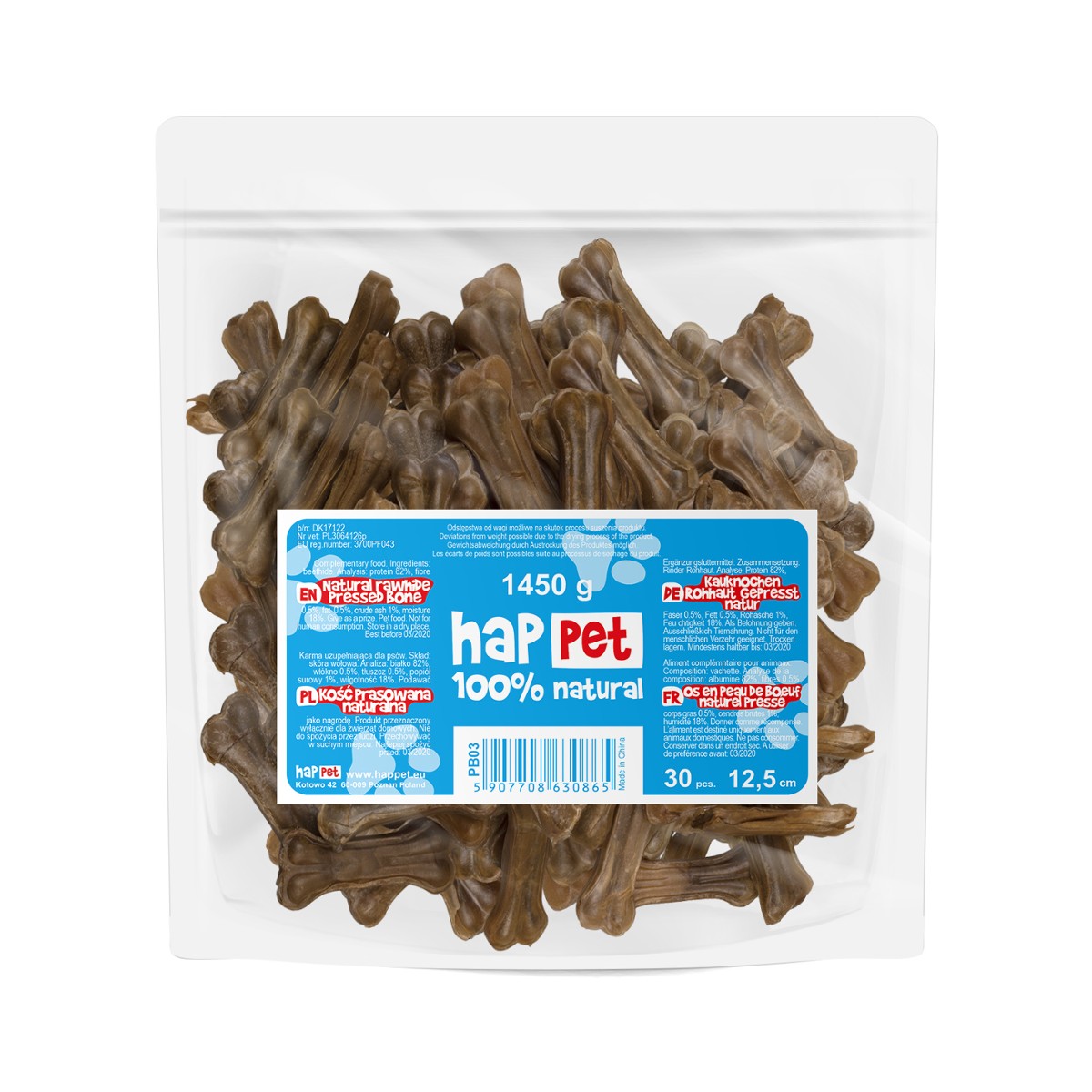 Kość prasowana Happet to doskonały wybór dla psów. Wykonana z rozgotowanej skóry wołowej, po wysuszeniu i sprasowaniu, zapewnia twardość, która nie tylko bawi, ale i odżywia. Ten naturalny przysmak jest całkowicie bezpieczny, nie zawiera sztucznych dodatków, co czyni go idealnym uzupełnieniem diety psa.