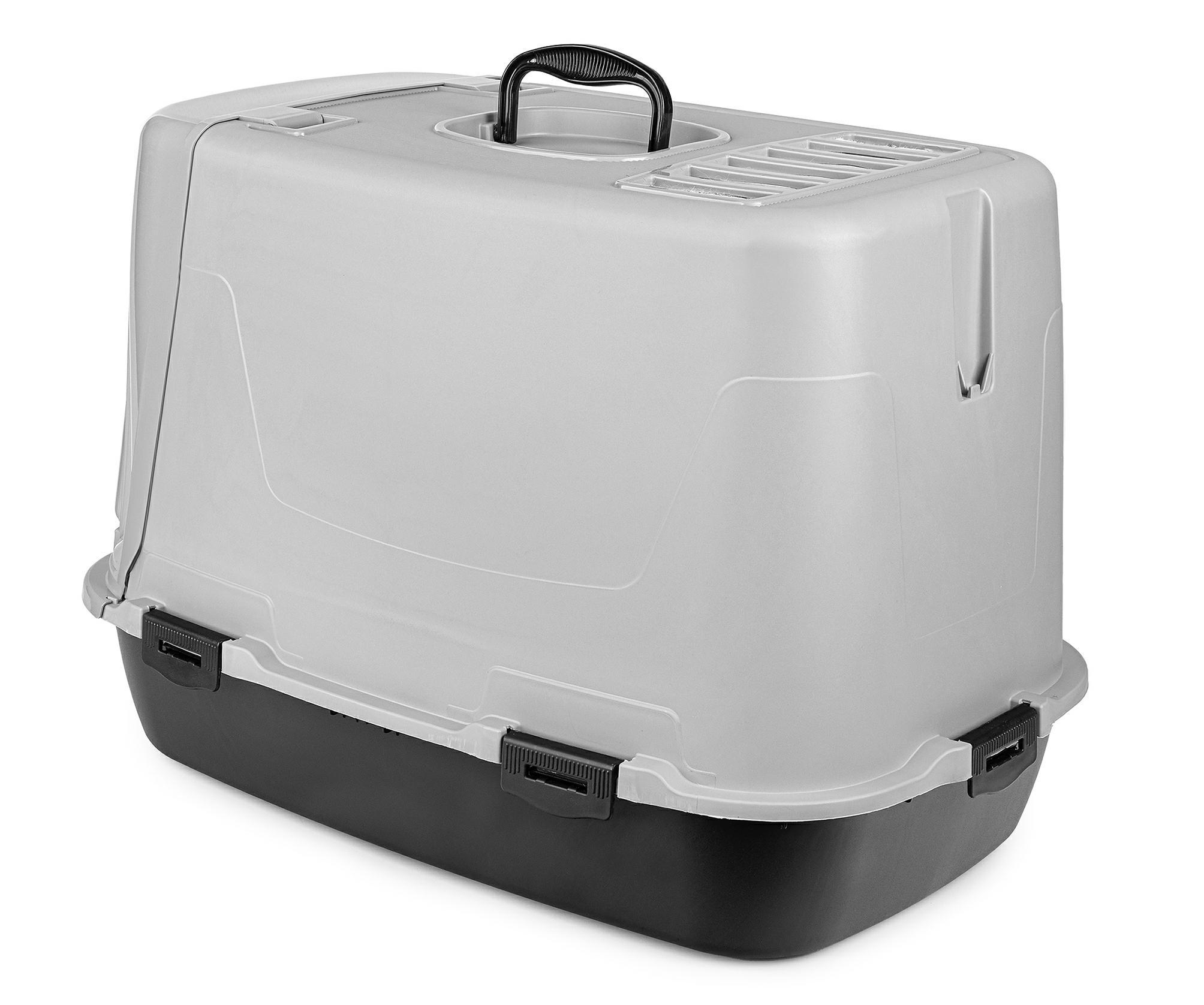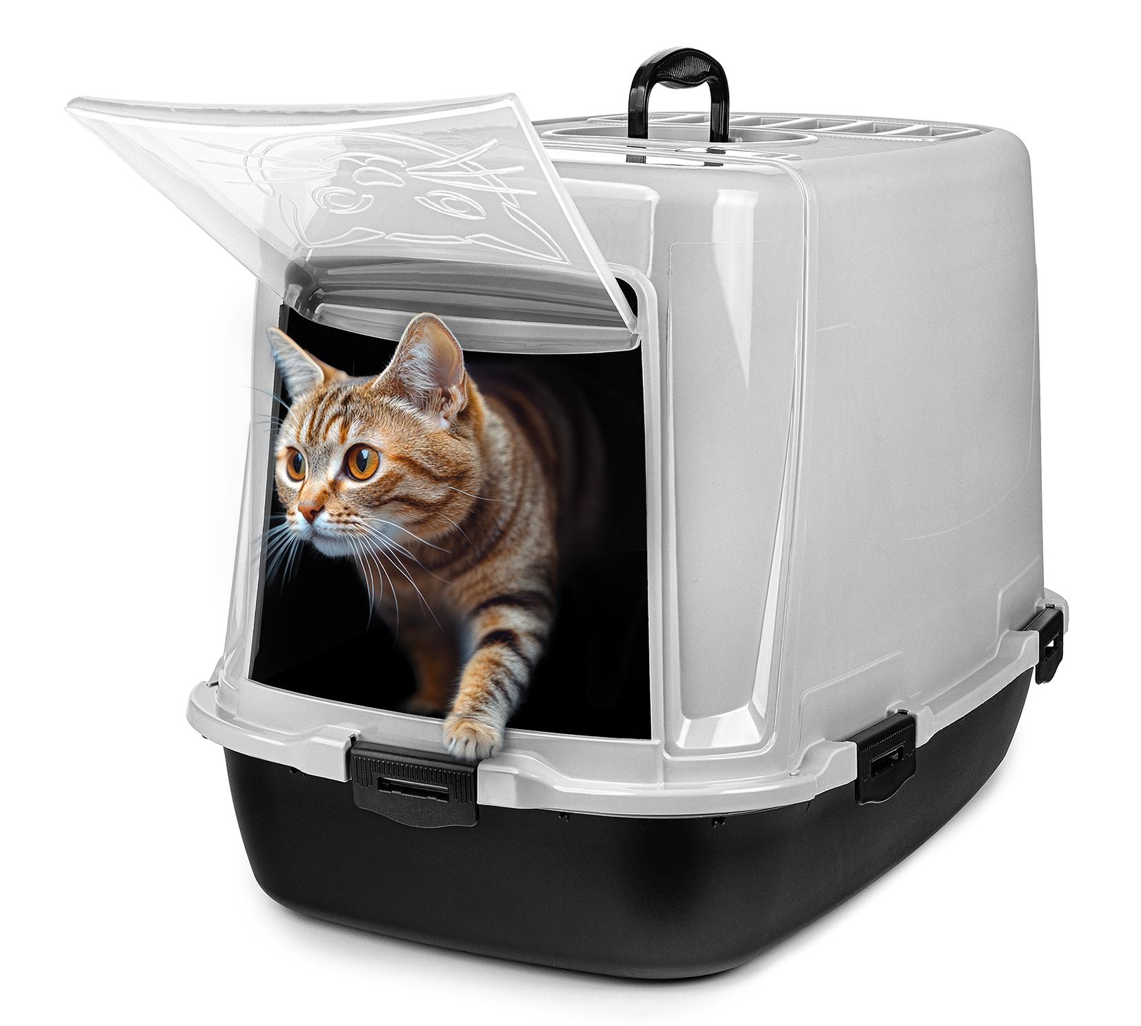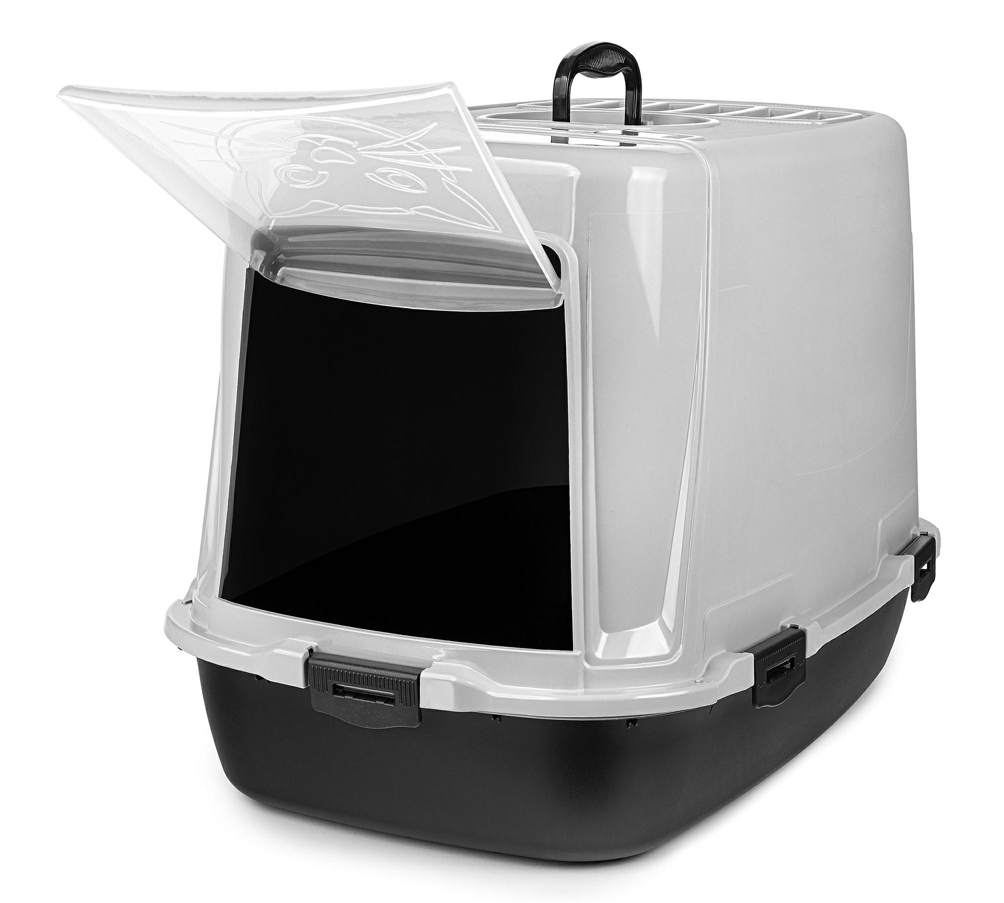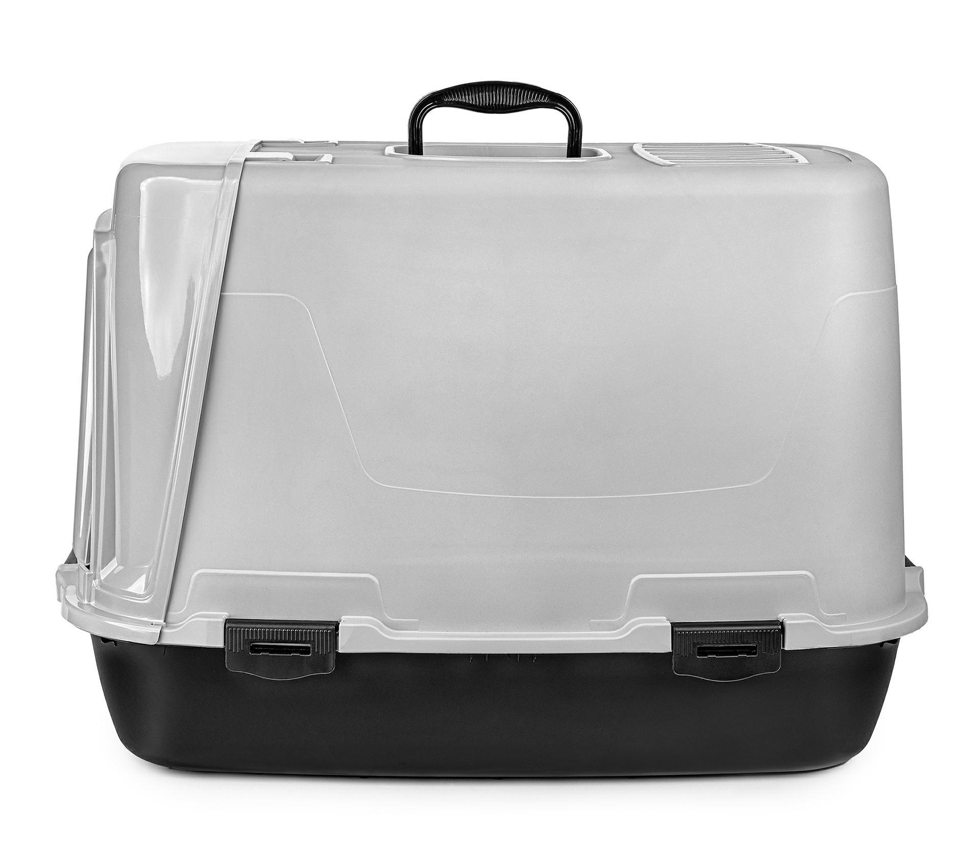 W praktycznym designie kuwety znajdują się drzwiczki na zawiasach oraz wygodna rączka do transportu. Górna część kuwety jest zdejmowana, co ułatwia jej czyszczenie. Produkt wykonany jest z trwałego materiału, który jest bezpieczny dla zwierząt.