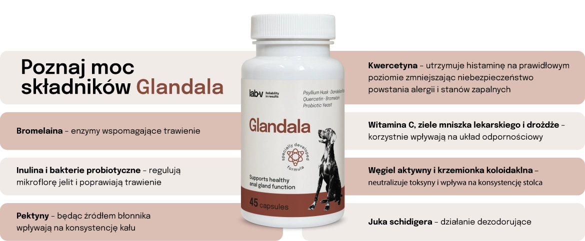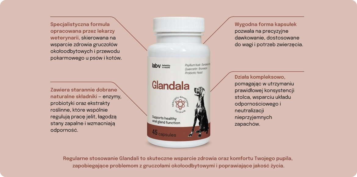 Lab-v Glandala to specjalistyczny preparat paszowy opracowany przez lekarzy weterynarii, który wspomaga prawidłowe funkcjonowanie gruczołów okołoodbytowych oraz reguluje pracę przewodu pokarmowego u psów. Dzięki naturalnym składnikom, takim jak błonnik, probiotyki i enzymy, preparat wspiera trawienie, poprawia perystaltykę jelit i pomaga w formowaniu prawidłowego stolca