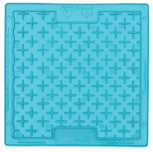 LickiMat Buddy ma labiryntowe kieszenie, idealne do podawania przysmaków, takich jak masło orzechowe czy rozmoczone ciasteczka. Mata jest także odpowiednia do mrożenia, co czyni ją uniwersalnym akcesorium dla każdego zwierzaka.