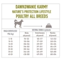 Dawkowanie: Dawkowanie karmy zależy od wagi psa oraz jego poziomu aktywności. Przykładowo, dla psa ważącego 10-15 kg, dzienna dawka wynosi od 152 do 239 g, w zależności od aktywności.