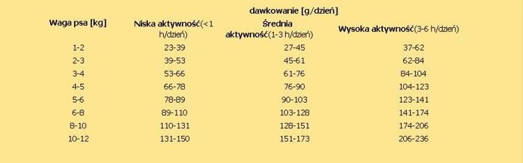 | Waga dorosłego psa (kg) | Dzienna dawka (g) |