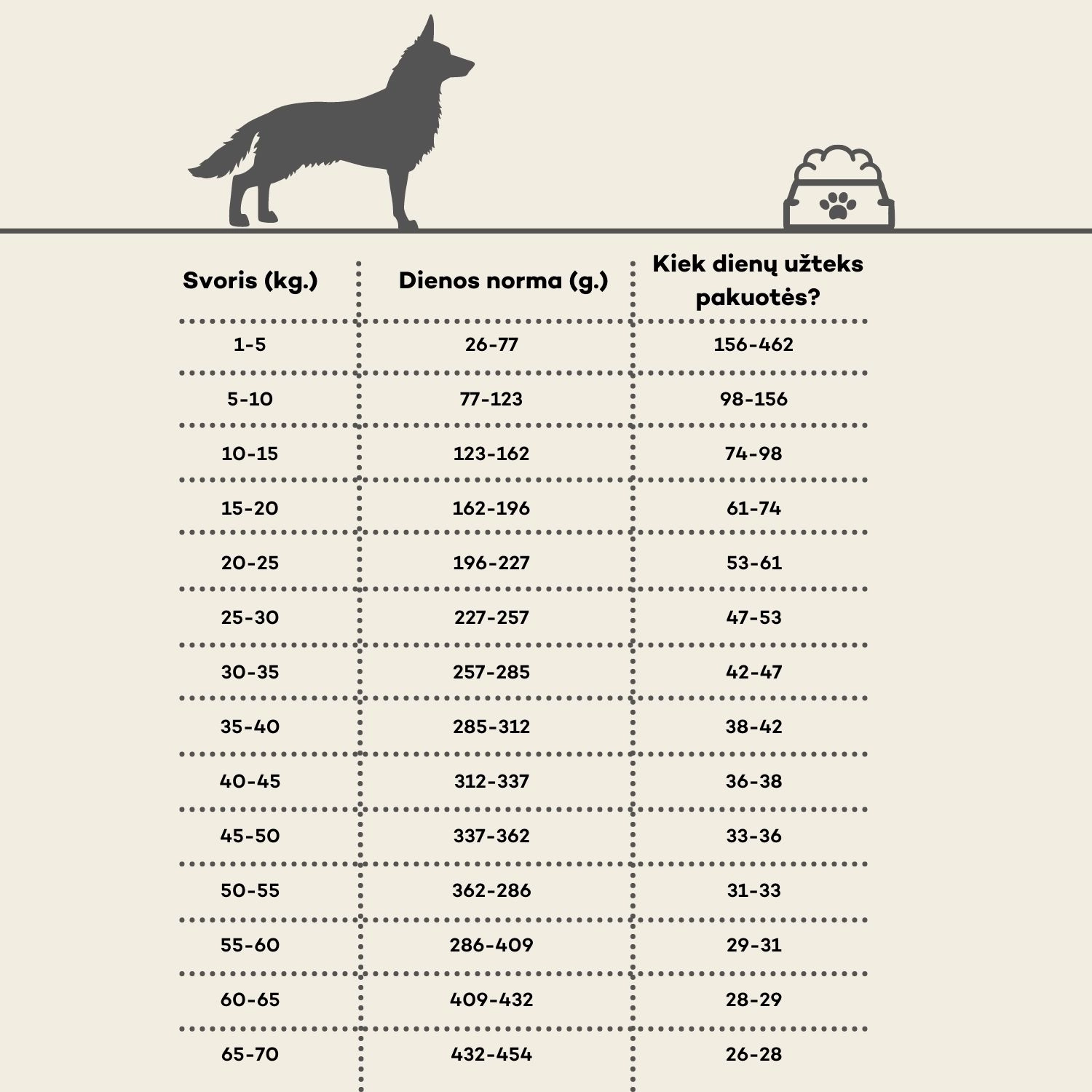 Dawkowanie: Karma dostosowana do wagi psa. Na przykład, dla psa ważącego 10-15 kg, zaleca się podawanie 123-162 g dziennie.