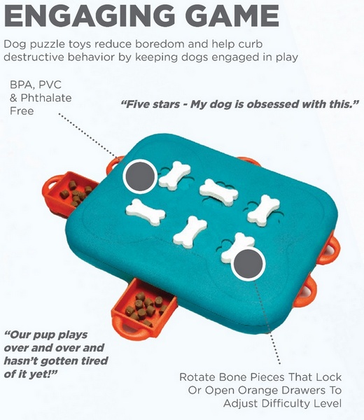 Wystarczy napełnić szufladki przysmakami lub suchą karmą, a następnie zachęcić psa do eksploracji. Twój czworonóg będzie musiał odblokować szufladki, aby dotrzeć do ukrytych łakoci. System blokady działa na zasadzie obrotu kosteczki umieszczonej na górze zabawki.