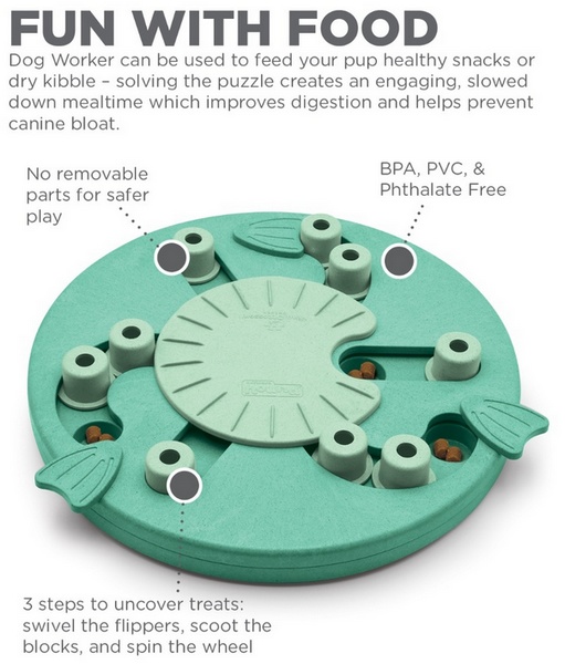 Interaktywna gra dla psów na poziomie trudności 3, która zachęca do odkrywania smakołyków. Wystarczy napełnić przegródki przysmakami lub suchą karmą, a pies zaczyna eksplorować zabawkę, używając łapek lub pyska, aby znaleźć ukryte skarby.
