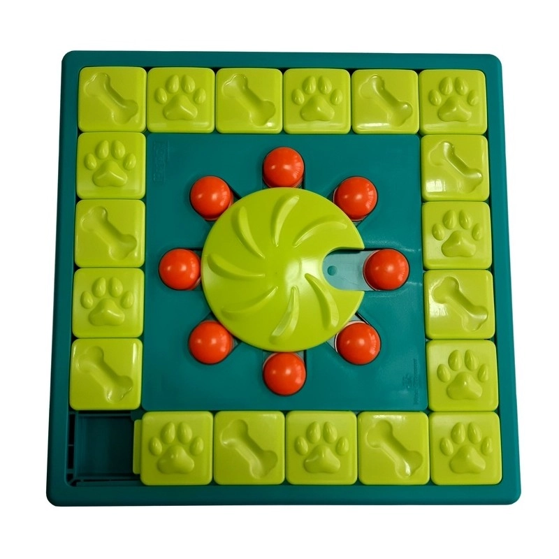 Wystarczy napełnić przegródki przysmakami lub suchą karmą, a następnie zachęcić pupila do eksploracji zabawki. Pies będzie musiał odblokować przegródki, przesuwając ruchome płytki, aby dotrzeć do ukrytych łakoci. Dodatkowo, obrotowe pokrętło w centralnej części zabawki skrywa kolejne smakołyki.