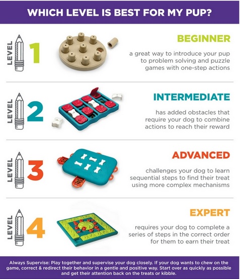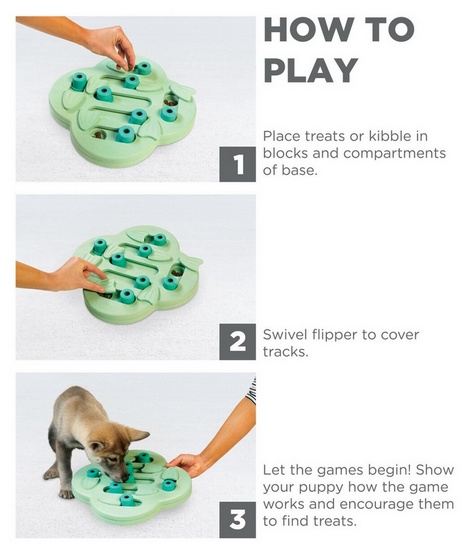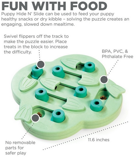 Gra Hide 'N Slide to idealna zabawa dla szczeniąt, która rozwija ich umiejętności poszukiwawcze. Wystarczy wypełnić przegródki smakołykami, aby zachęcić pupila do odkrywania ich. Szczeniak będzie mógł węszyć, przesuwać elementy i używać pyszczka, aby dotrzeć do ukrytych łakoci.