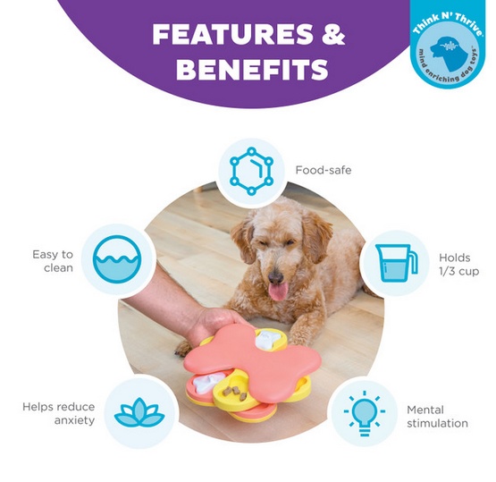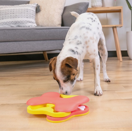 Gra składa się z kilku poziomów, które można obracać. Dzięki temu pies musi używać swojego nosa i łap, aby dotrzeć do ukrytych smakołyków. To wspaniała forma stymulacji umysłowej, która pomaga w walce z nudą i destrukcyjnymi zachowaniami.