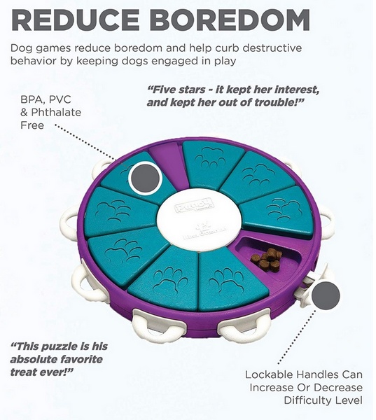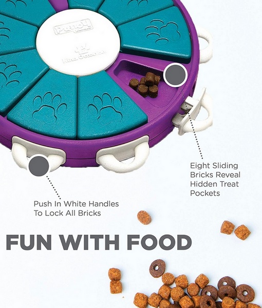 W trakcie zabawy pies będzie musiał używać swojego nosa oraz łap, aby odblokować przegródki i dotrzeć do ukrytych łakoci. System blokady polega na przesuwaniu uchwytu, co stanowi dodatkowe wyzwanie. To świetny sposób na stymulację umysłową i fizyczną!