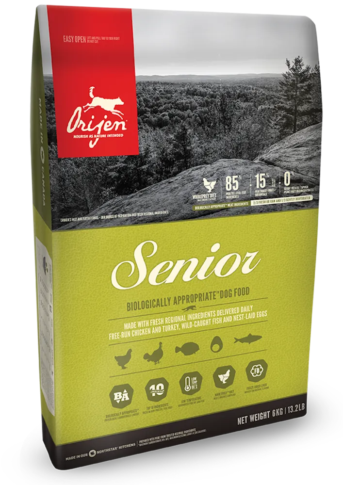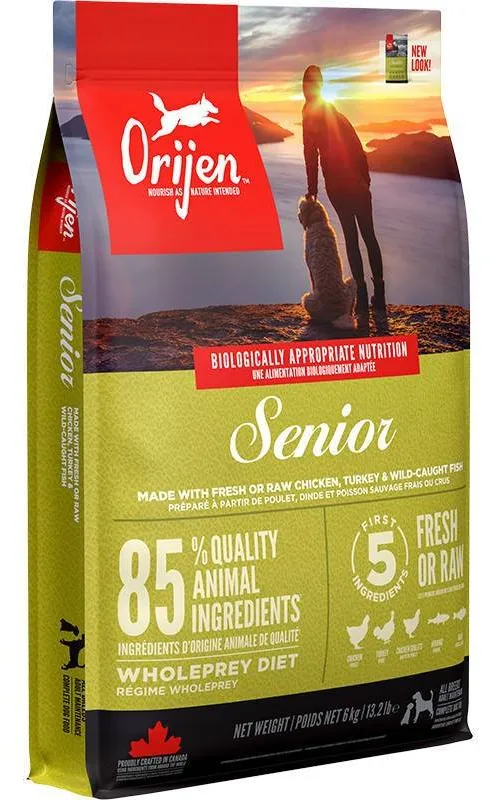 Orijen Senior 6kg to pełnoporcjowa karma przeznaczona dla starszych psów wszystkich ras. Dzięki starannie dobranym składnikom, takim jak drobiowe mięso, ryby oraz całe jaja, karma wspiera zdrowie i dobre samopoczucie czworonogów w zaawansowanym wieku.