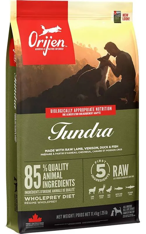 Skład ORIJEN Tundra to 38% białka, co odpowiada biologicznym potrzebom psów. Dwa trzecie mięsa jest świeże lub surowe, a jedna trzecia to delikatnie dehydratyzowane składniki, które są skoncentrowanym źródłem białka.