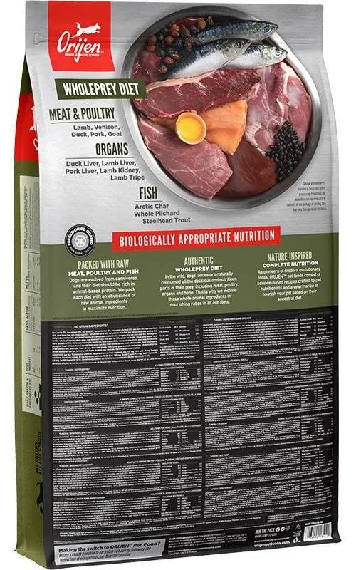 ORIJEN zawiera 38% odżywczego białka i ograniczoną ilość węglowodanów, dzięki czemu odżywia psy zgodnie z ich biologicznymi potrzebami.