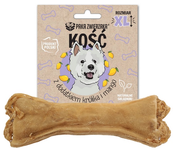 Paka Zwierzaka Kość z dodatkiem królika i mango XL (17 cm) to idealny przysmak dla Twojego psa. Wykonana ręcznie, z naturalnych składników, zapewnia bezpieczeństwo podczas gryzienia. Nie zawiera klejów ani barwników, co czyni ją zdrowym wyborem. Kość jest delikatna dla dziąseł i nie ma ostrych elementów, co zwiększa komfort użytkowania.