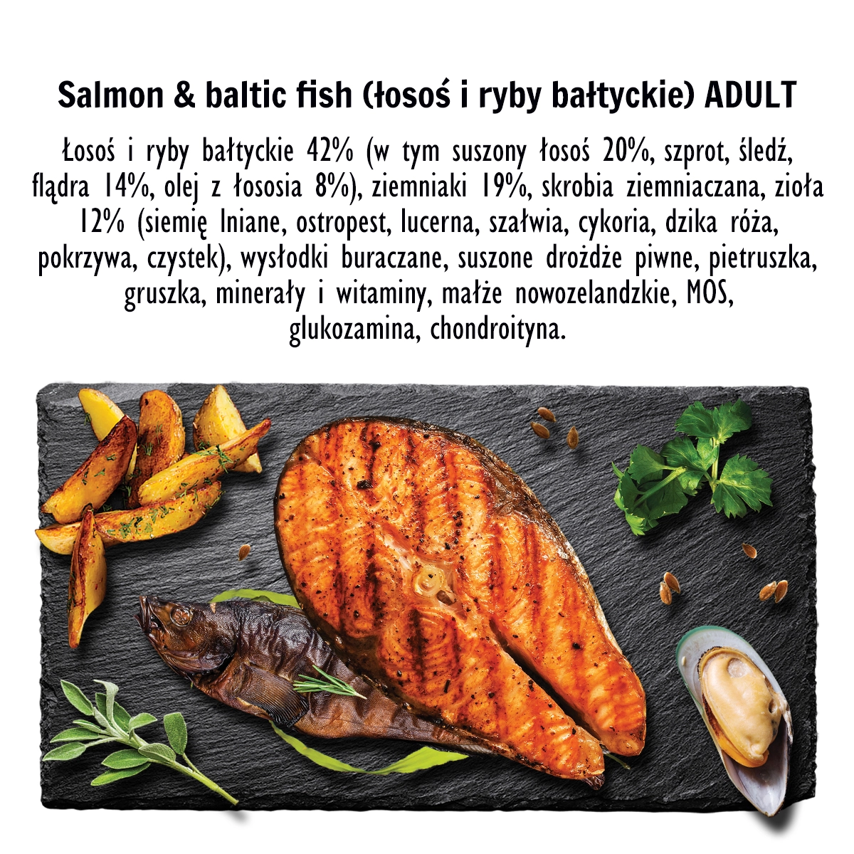 W składzie znajduje się 73% łososia i ryb bałtyckich, co zapewnia bogactwo witamin i minerałów. Karma jest wolna od zbóż, grochu, konserwantów i sztucznych barwników, co czyni ją idealną dla psów z wrażliwym żołądkiem oraz nietolerancjami pokarmowymi.
