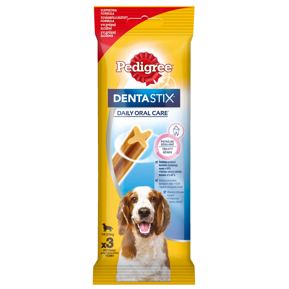 Karma uzupełniająca dla psa PEDIGREE DentaStix (średnie rasy) 3 szt., 77 g to dietetyczny przysmak, który ułatwia utrzymanie należytej higieny jamy ustnej zwierzęcia. Wielkość produktu została dopasowana do rozmiaru szczęki przedstawicieli średnich ras, dzięki czemu gryzienie smakołyku dostarcza czworonogom wiele radości. Odpowiednio przemyślany kształt umożliwia dotarcie karmy do każdego zakamarka w pysku Twojego psa i redukcję szkodliwego kamienia nazębnego aż do 80%. Regularne pozbywanie się nalotu zapobiega groźnym chorobom, takim jak zapalenie dziąseł i przyzębia, a nawet paradontozie. Atrakcyjny mięsny smak i aromat pałeczek DentaStix sprawia, że produkt może być wykorzystywany jako nagroda w trakcie tresury. Wysokiej jakości składniki użyte do produkcji karmy gwarantują całkowite bezpieczeństwo dla Twojego pupila, dostarczając mu ponadto cennej witaminy E i cynku. Poręczna saszetka, zawierająca zestaw trzech przysmaków, idealnie sprawdza się szczególnie w trakcie podróży i dłuższych spacerów.