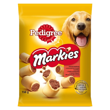 Pedigree Markies to przysmak dla dorosłych psów, który jest chrupiący i bardzo smakowity a to za sprawą smacznego nadzienia. Przysmaki te można turlać, rzucać i łapać i dzięki temu zapewnić psu pyszną zabawę. Pedigree Markies są wzbogacone o kwasy tłuszczowe Omega-3, witaminy i minerały, a do tego nie zawierają sztucznych barwników. Podając psu ten przysmak dbasz o jego dobre samopoczucie.