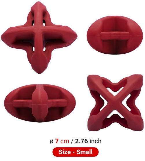 Rozmiar zabawki wynosi 7 cm. Zabawka Geo-Astro dostępna jest w różnych twardościach: czerwona ma średnią twardość, co czyni ją idealną dla psów o różnym stopniu żucia.