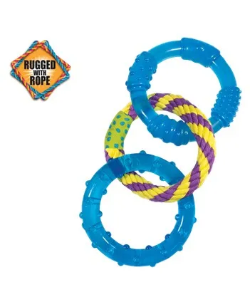 Dodatkowo, ta zabawka wspiera rozwój mięśni szczęki oraz działa jako masażer dla dziąseł dzięki swojej specjalnej strukturze. Gryzak z bawełnianych ringów pomaga także w usuwaniu kamienia nazębnego, co przyczynia się do zdrowia zębów Twojego psa.