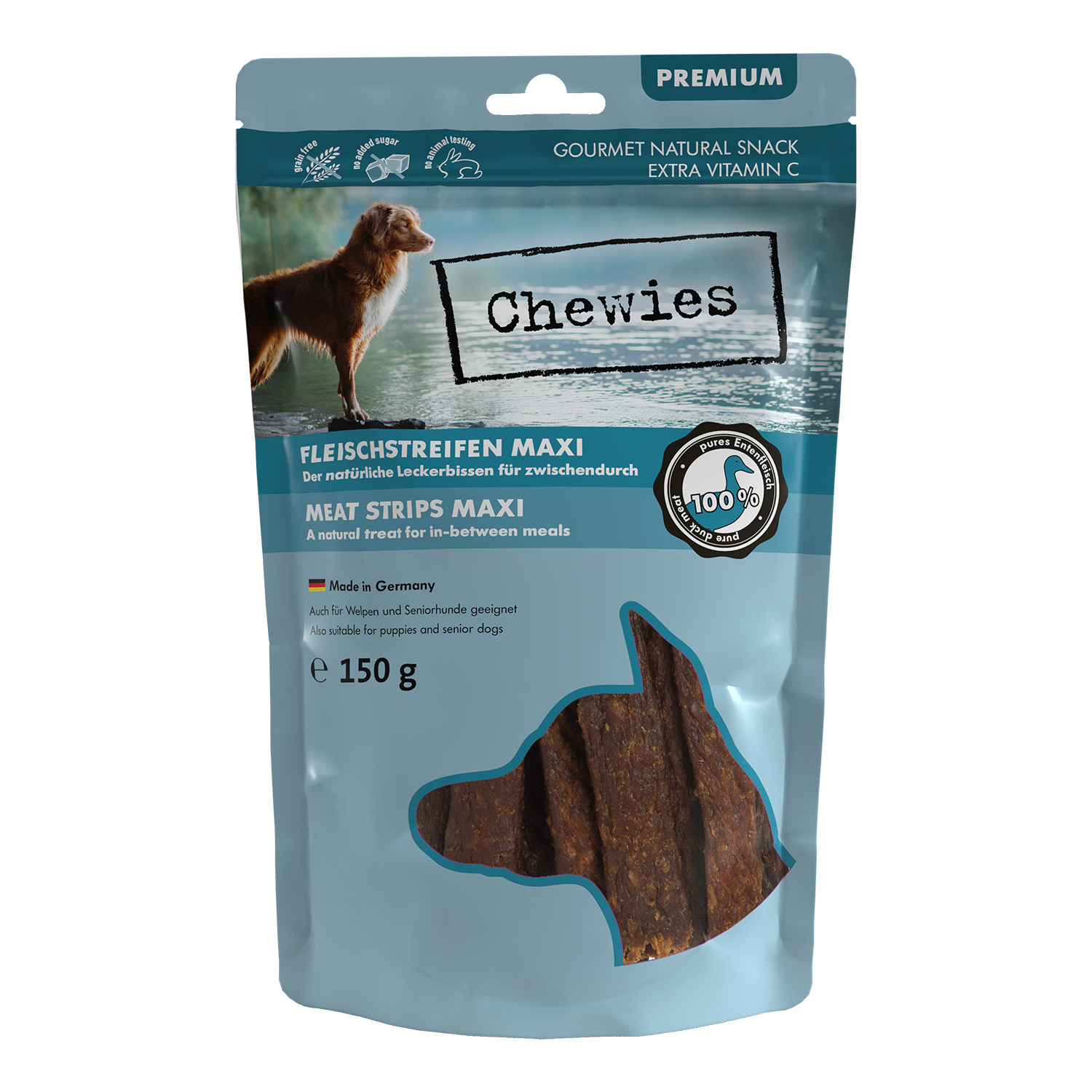Chewies Paski mięsne Kaczka to delikatnie suszone mięso z dodatkiem witaminy C. Dzięki specjalnej produkcji wysokiej jakości składniki odżywcze mięsa są prawie całkowicie zachowane. Paski mięsne do żucia to pyszna i zdrowa nagroda między posiłkami. Są…